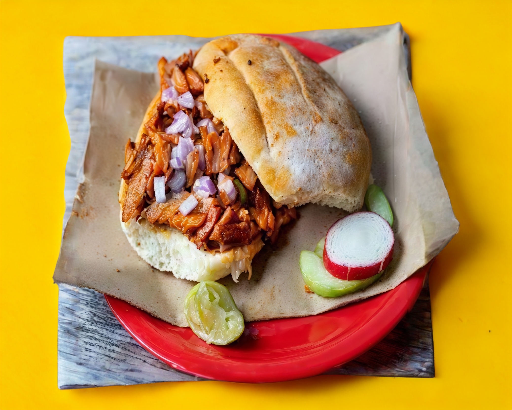 Pierna española ,milanesa, queso Oaxaca , jitomate, cebolla, aguacate mayonesa