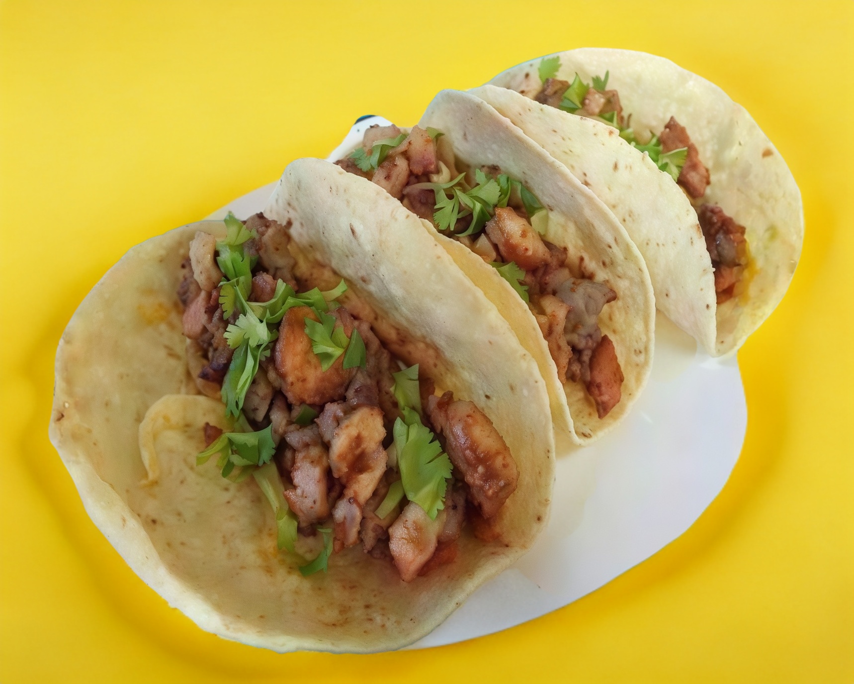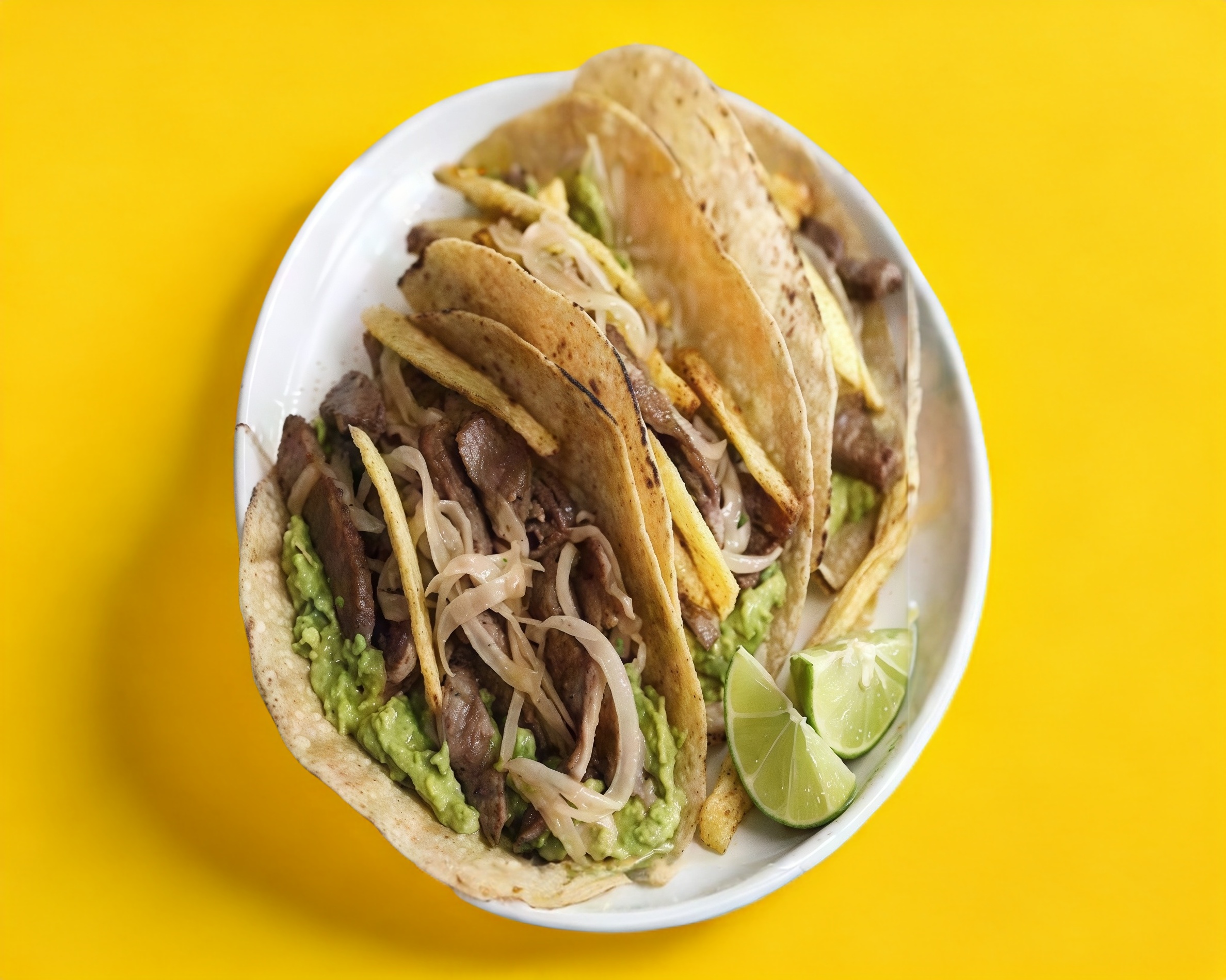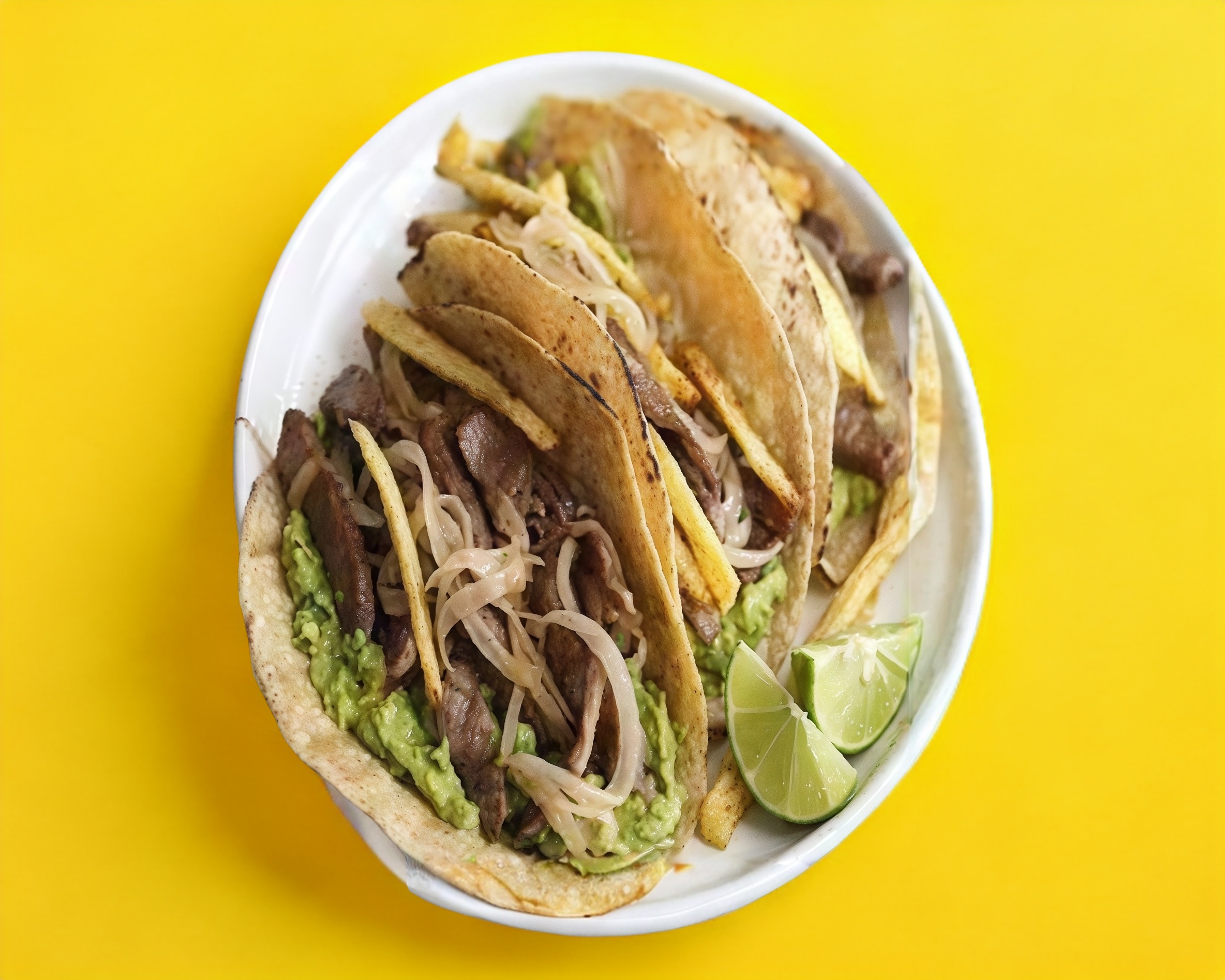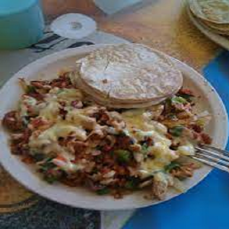 Chicharrón de queso relleno de bistec con cilantro y cebolla sobre 3 tortillas de harina.