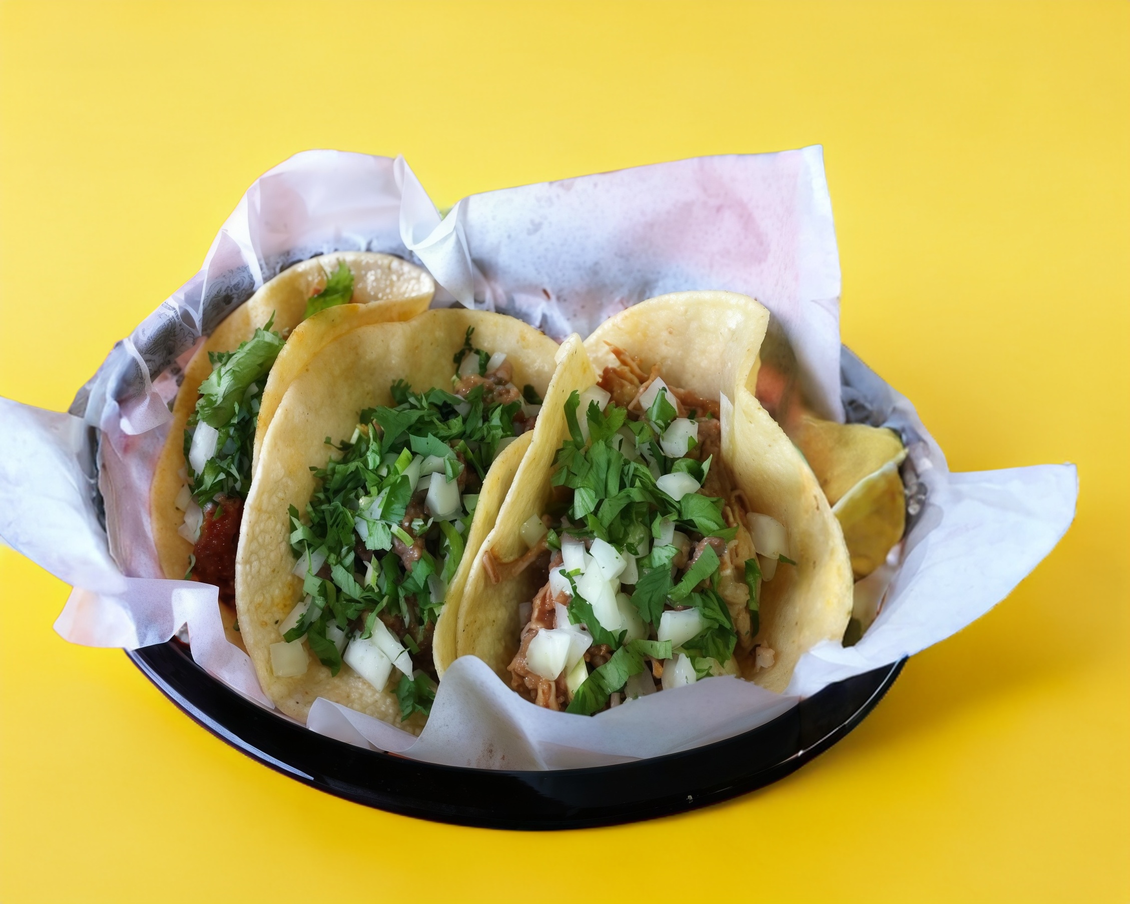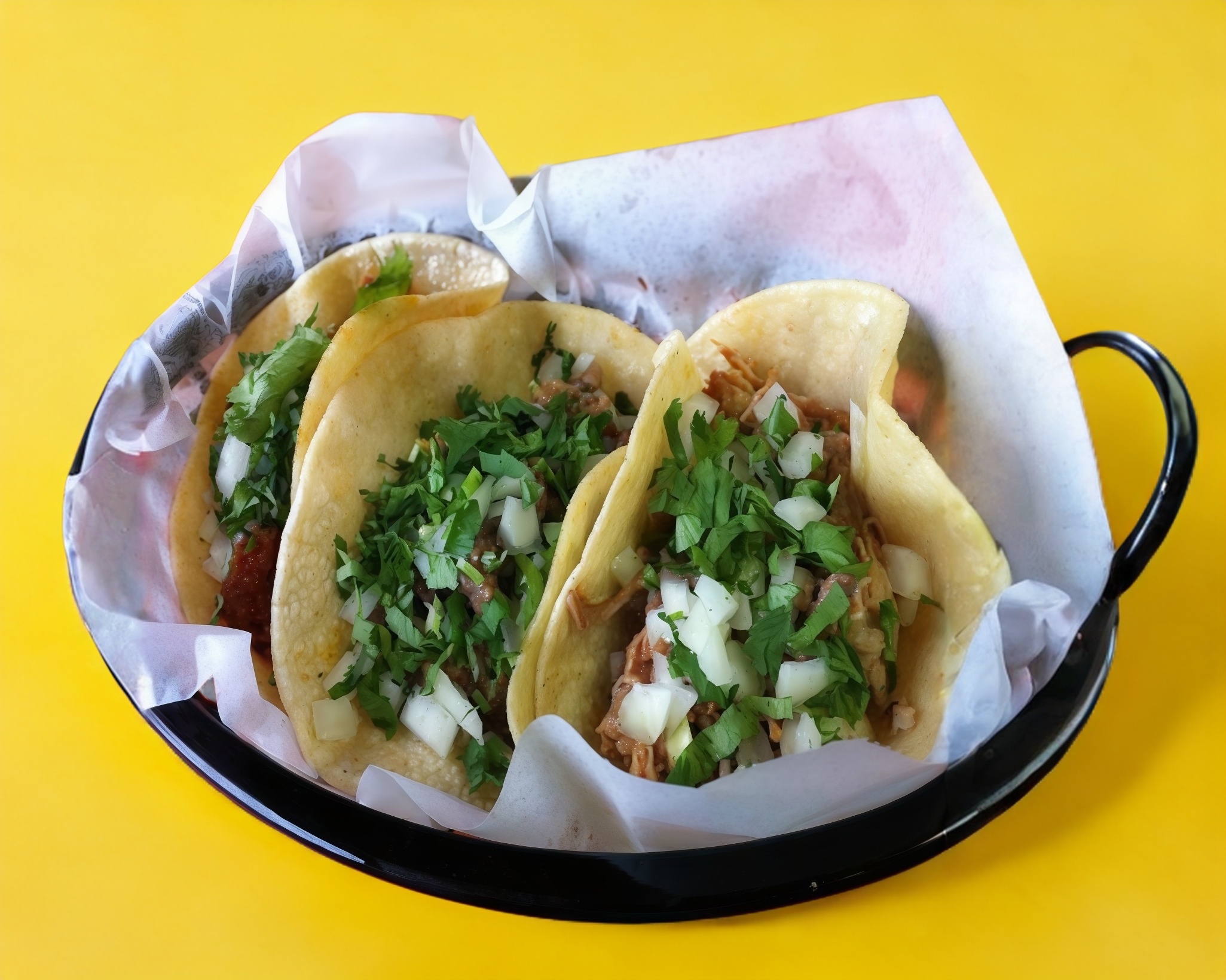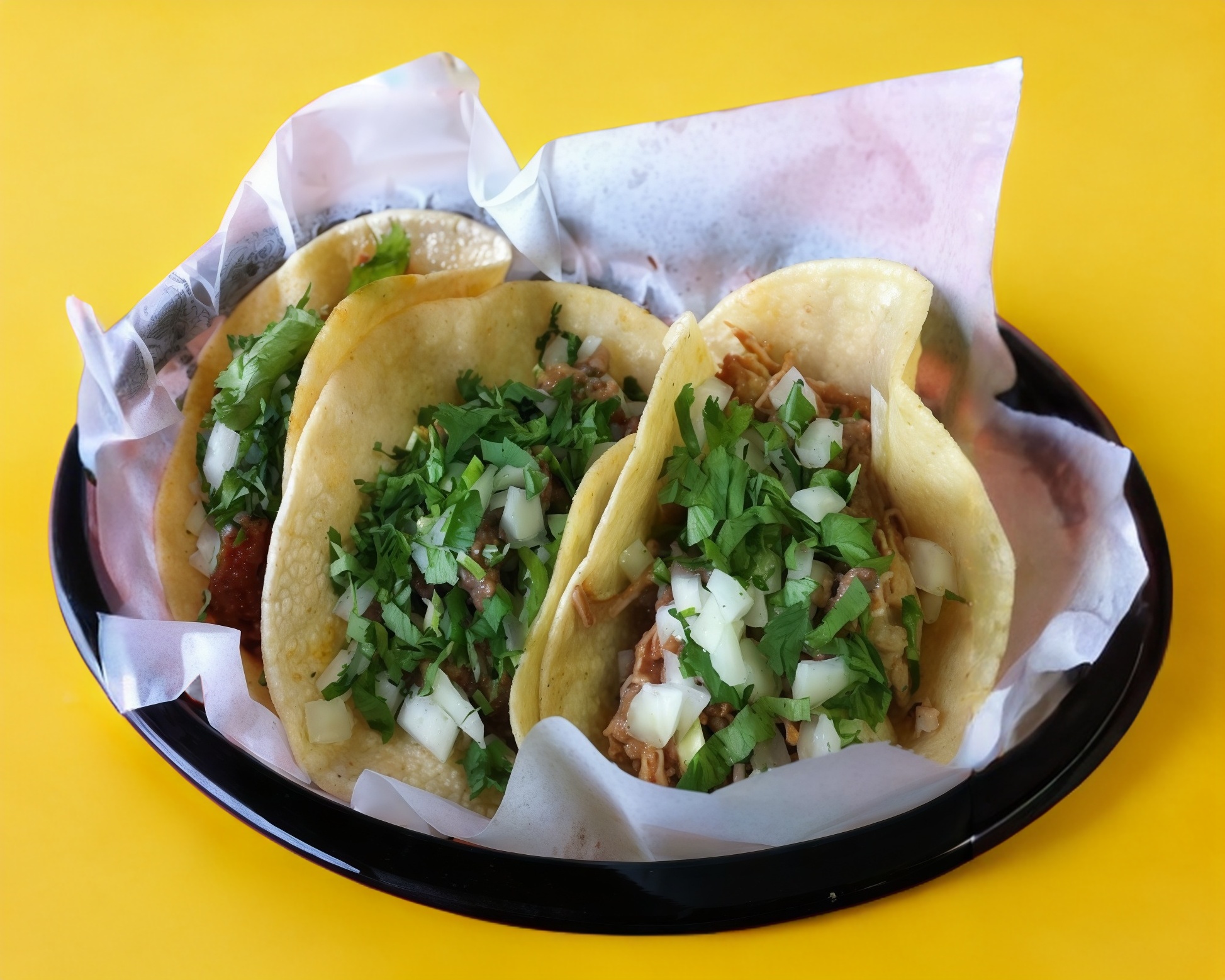 Chicharrón de queso relleno de bistec con cilantro y cebolla sobre 3 tortillas de harina.