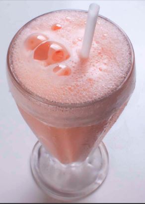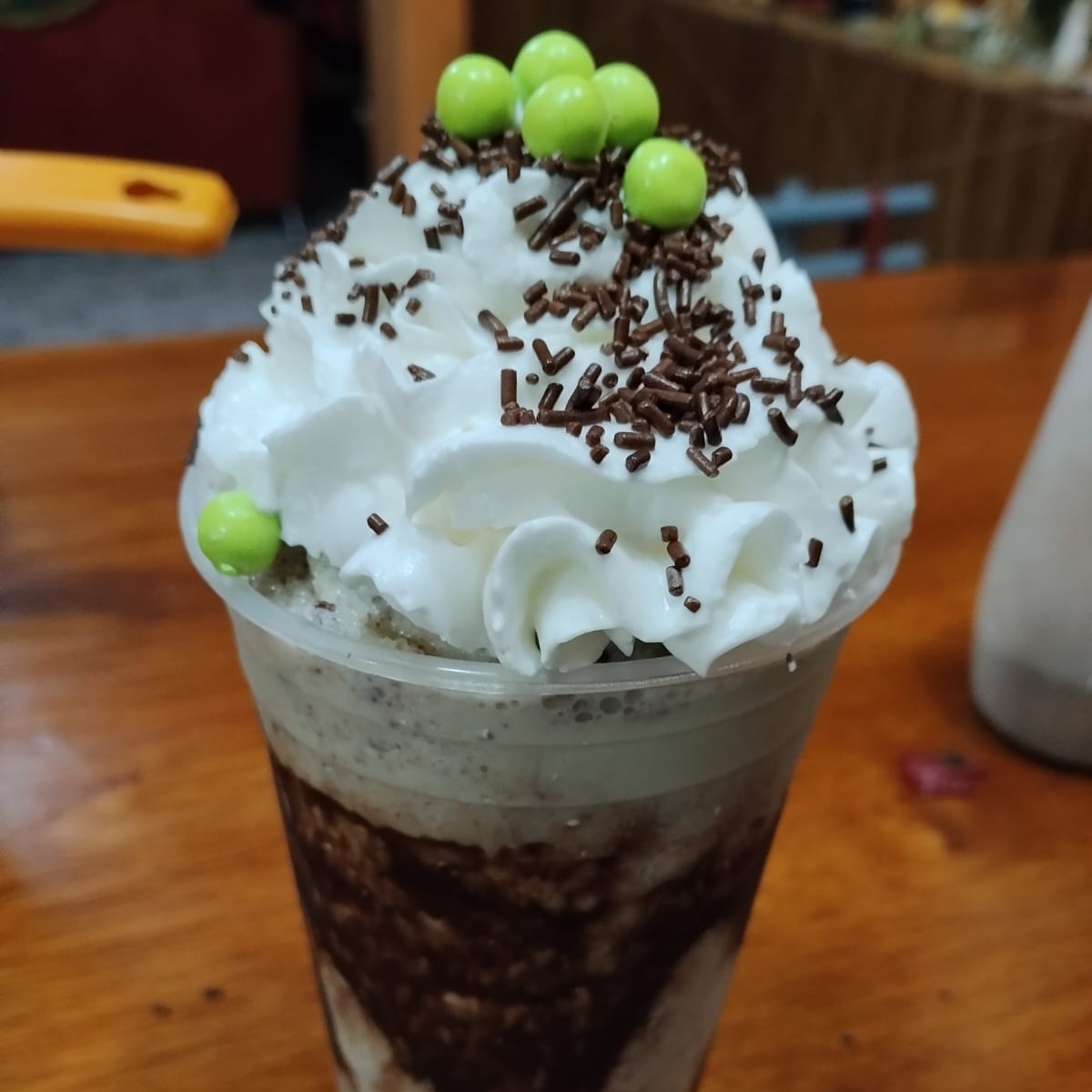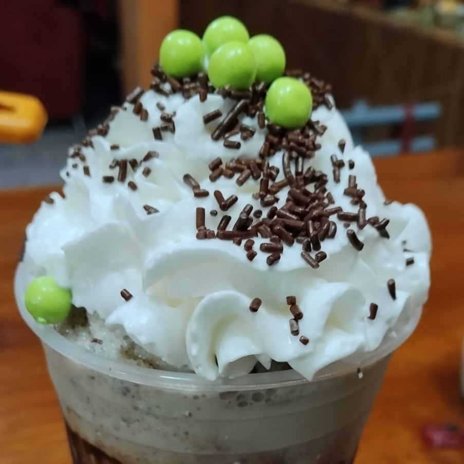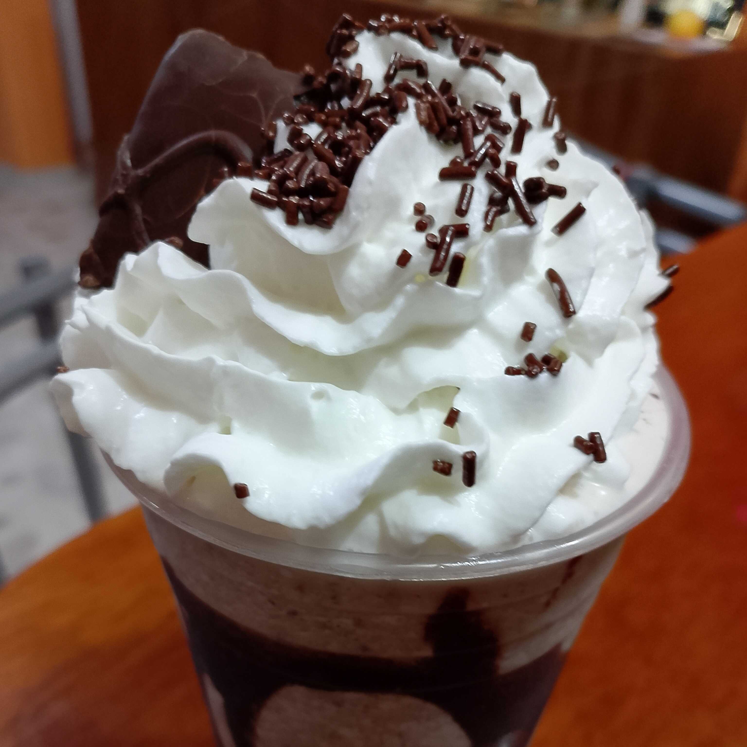 Leche deslactosada, 2 Kinder Delice, crema batida y granillo