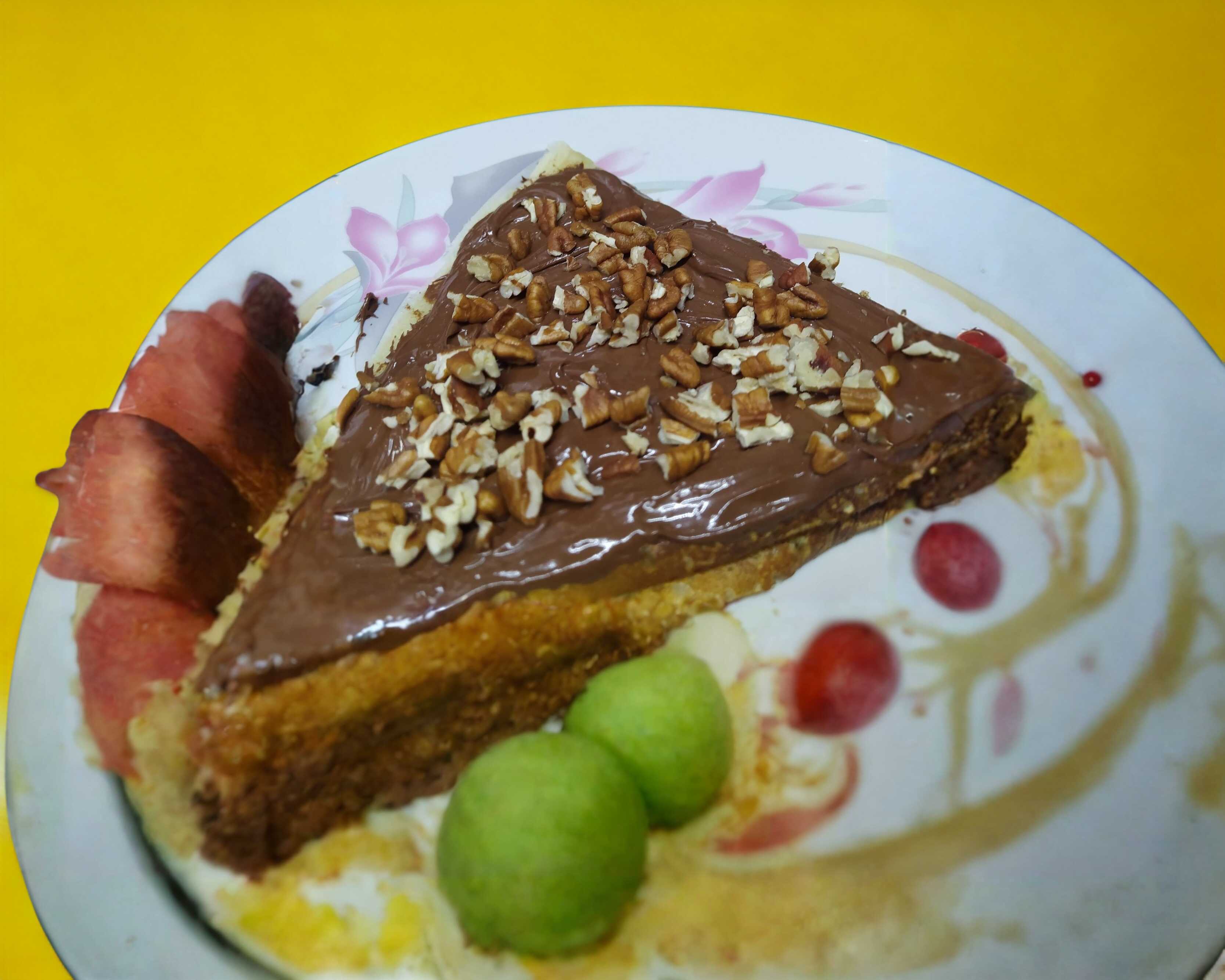 Untada de queso crema rellena de mango y bañada con lechera y nuez.