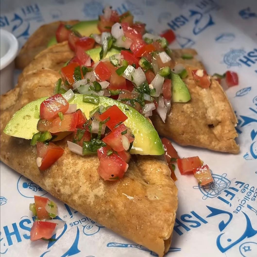 Orden de 3 pescadillas sazonadas con la receta de la casa, acompañadas de rebanadas de aguacate.