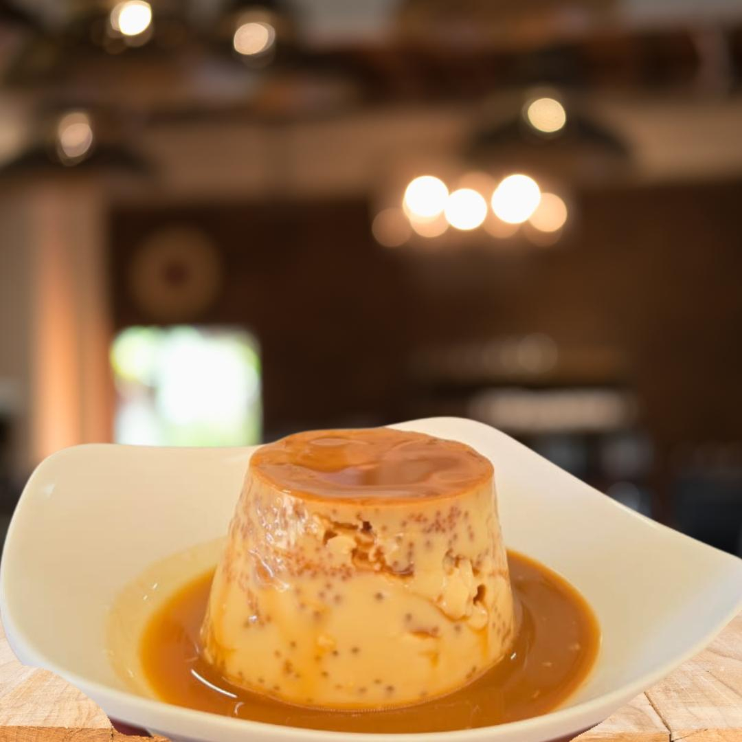 Flan casero de la abuela de amaretto, porción personal.