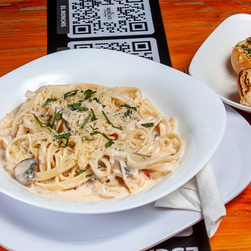 Fettuccine a la crema con camarones y champiñones acompañada de dos panes de la casa.