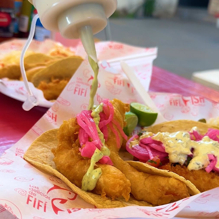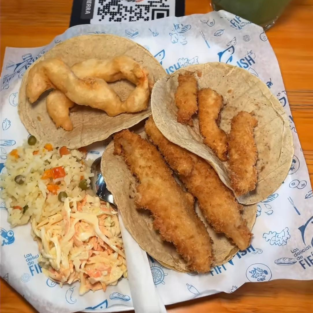 Taco en tortilla de maíz con filete de pescado rebosado estilo Baja con guarnición a elegir. Prepáralos con tus aderezos y acompañamientos favoritos.