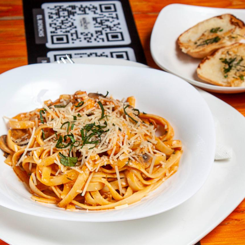 Fettuccine al chipotle con camarones y champiñones acompañada de dos panes de la casa.