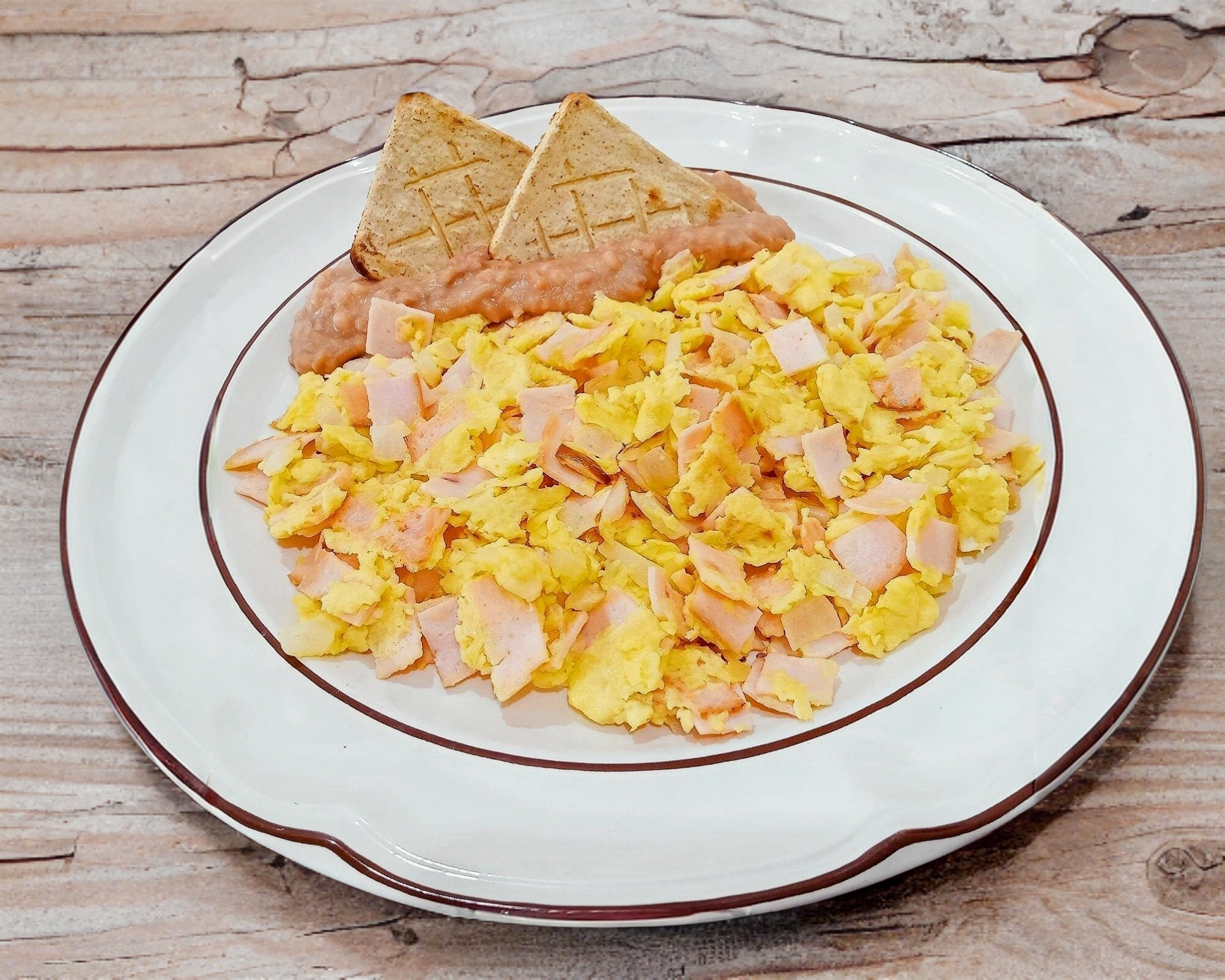 Cuatro huevos, jamón,sal , frijoles refritos,totopos ,un bolillo