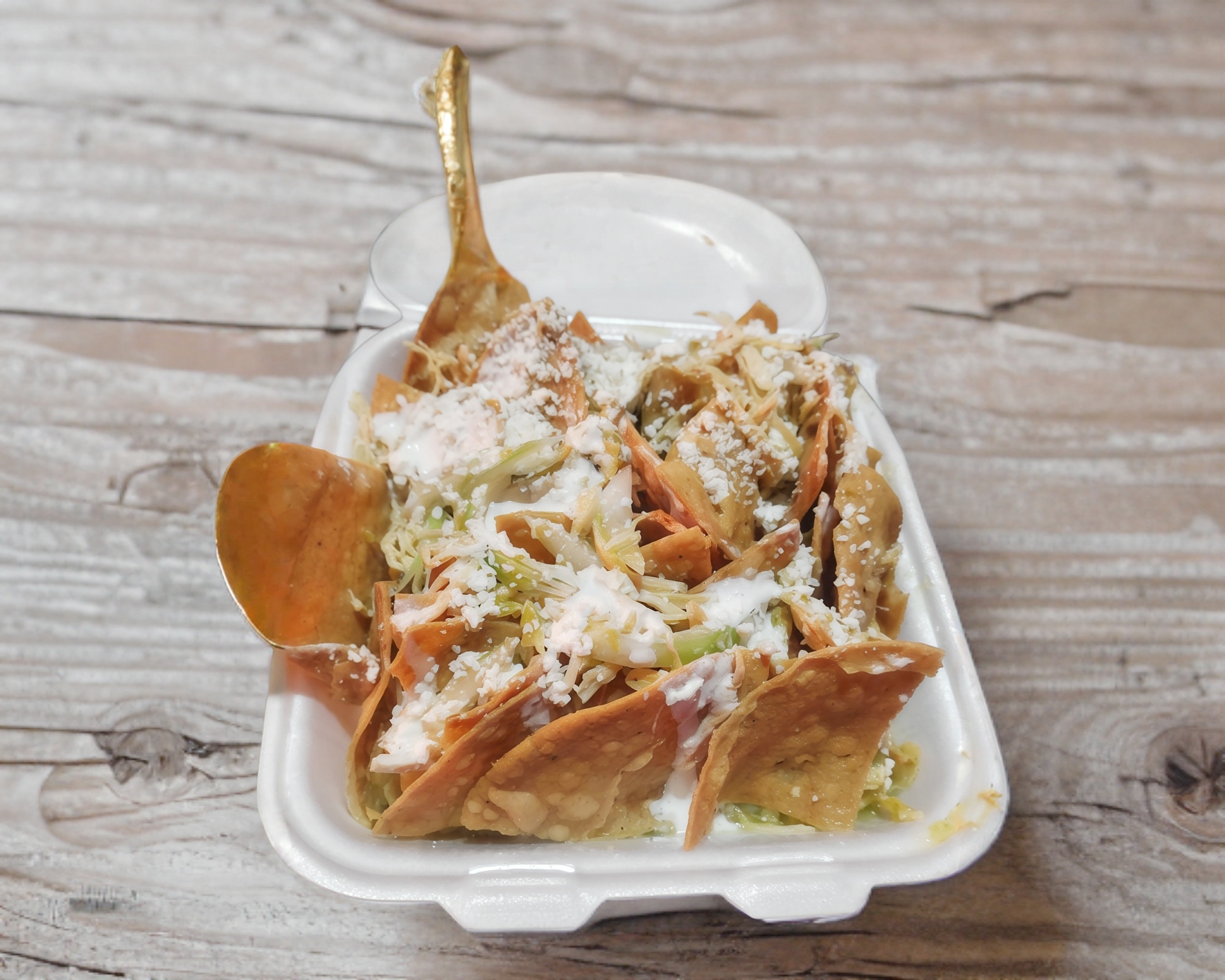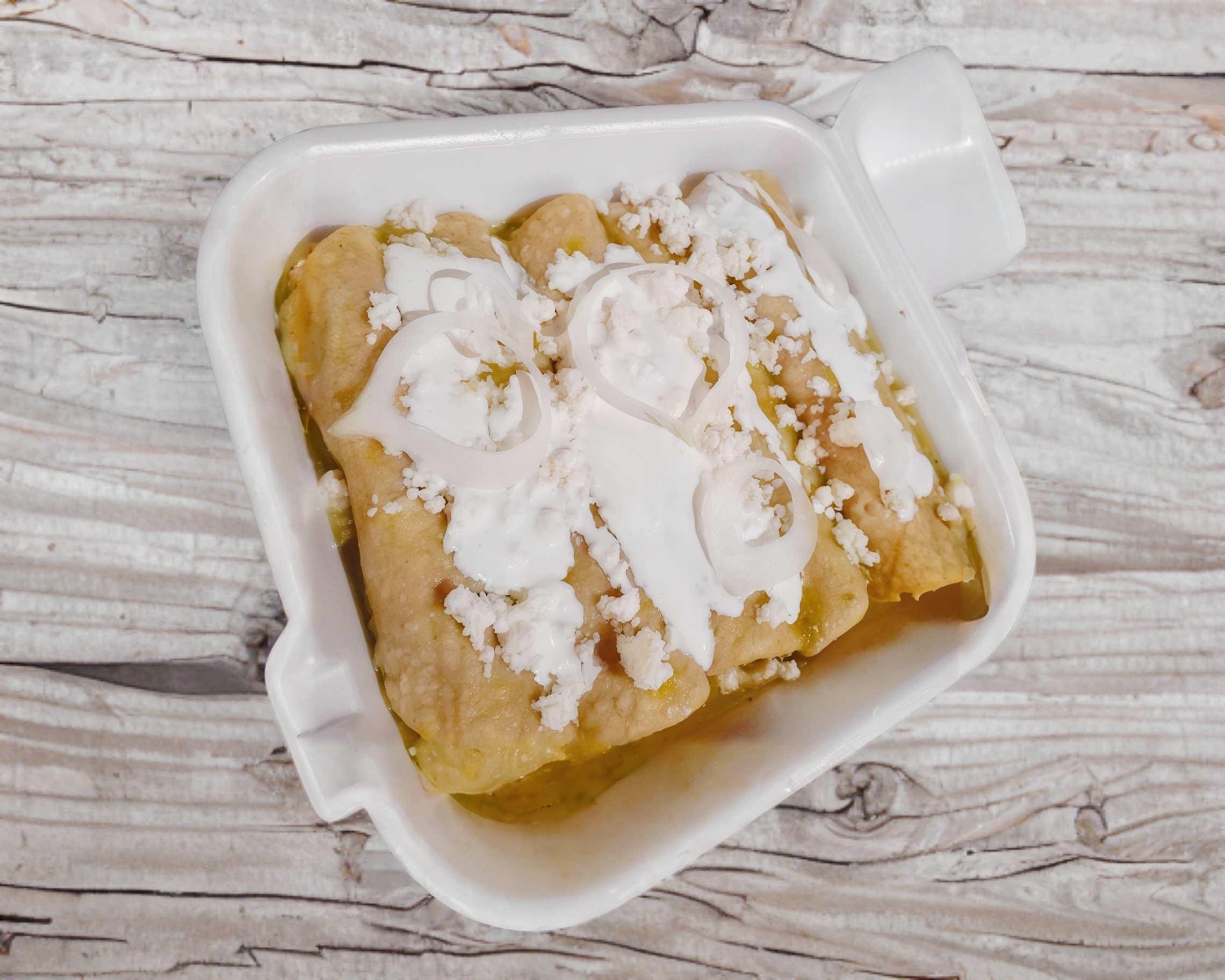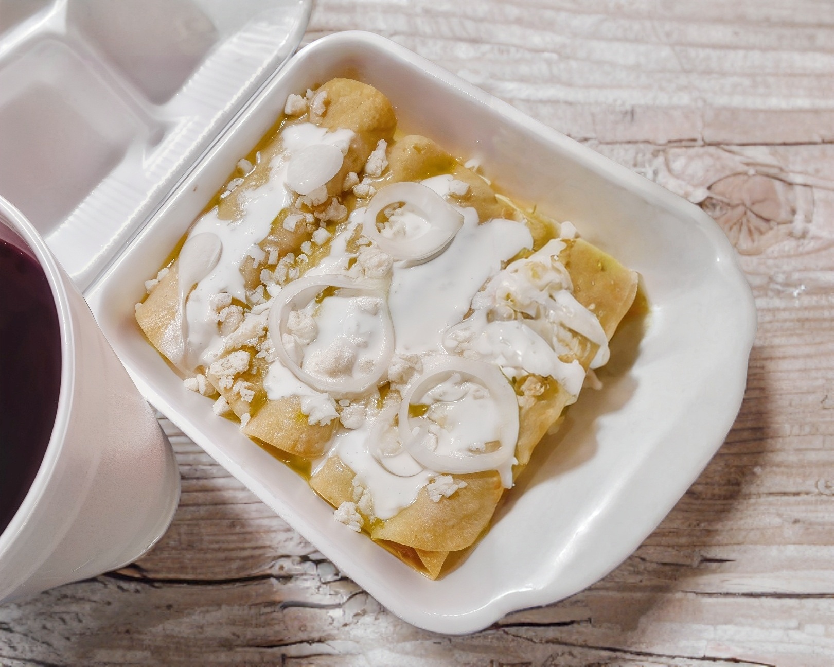 5 tortillas, pollo, chilito verde, crema, queso, y cebolla (Cubiertos y servilletas)