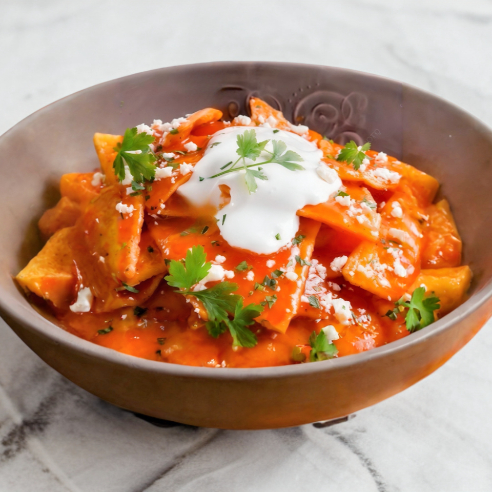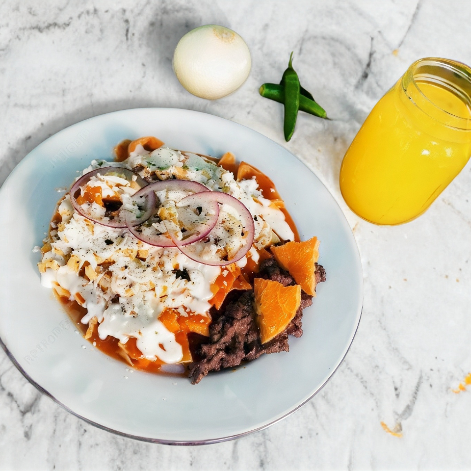 Chilaquiles rojos: elige tu proteína, ya preparados.