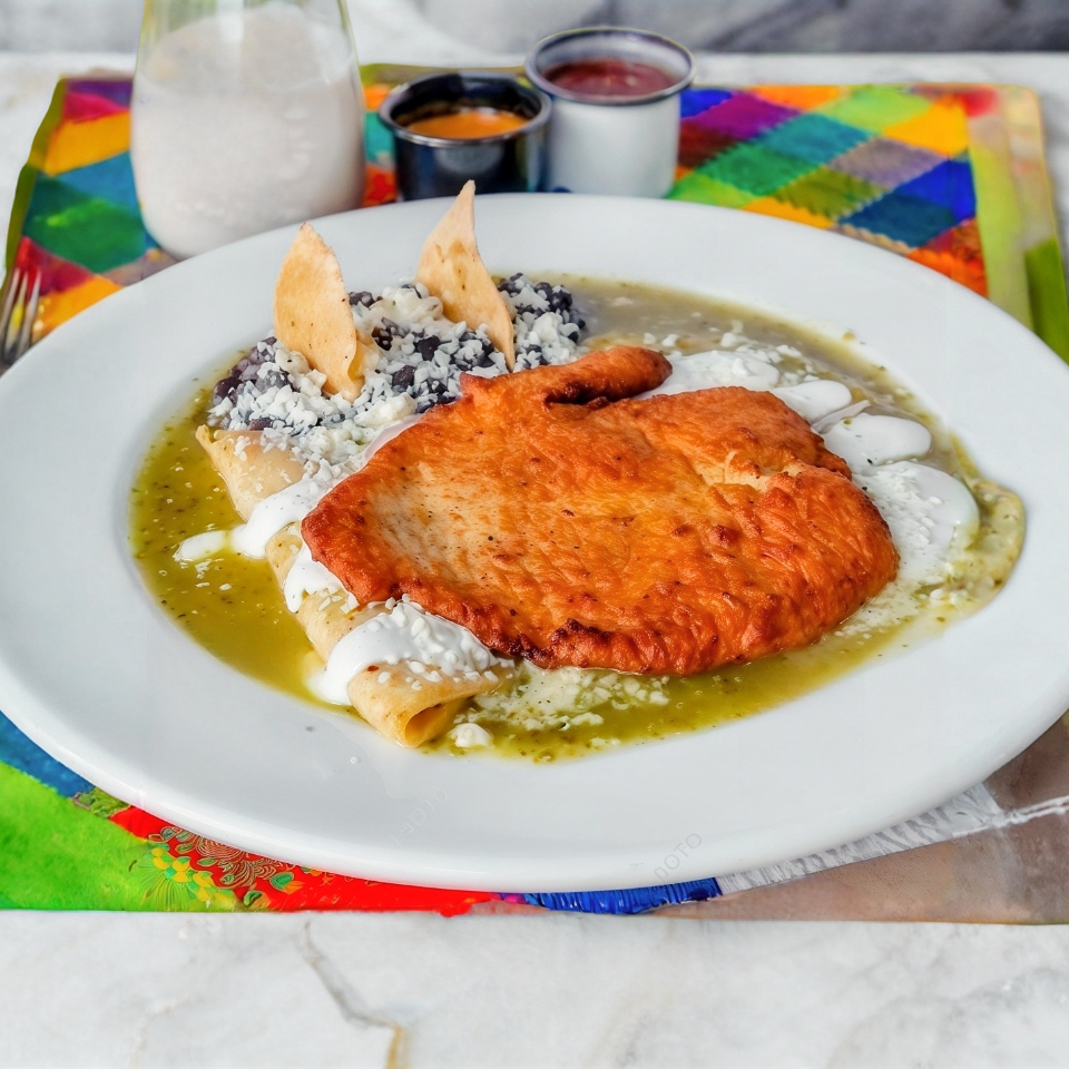 Enchiladas individuales: con una milanesa empanizada de pollo encima, además del pollo que llevan en su interior.