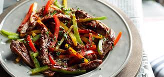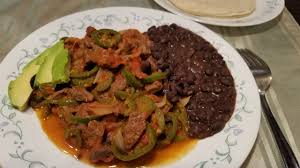 Suave carne de res con cebollas caramelizadas, papas a la francesa y chiles toreados.