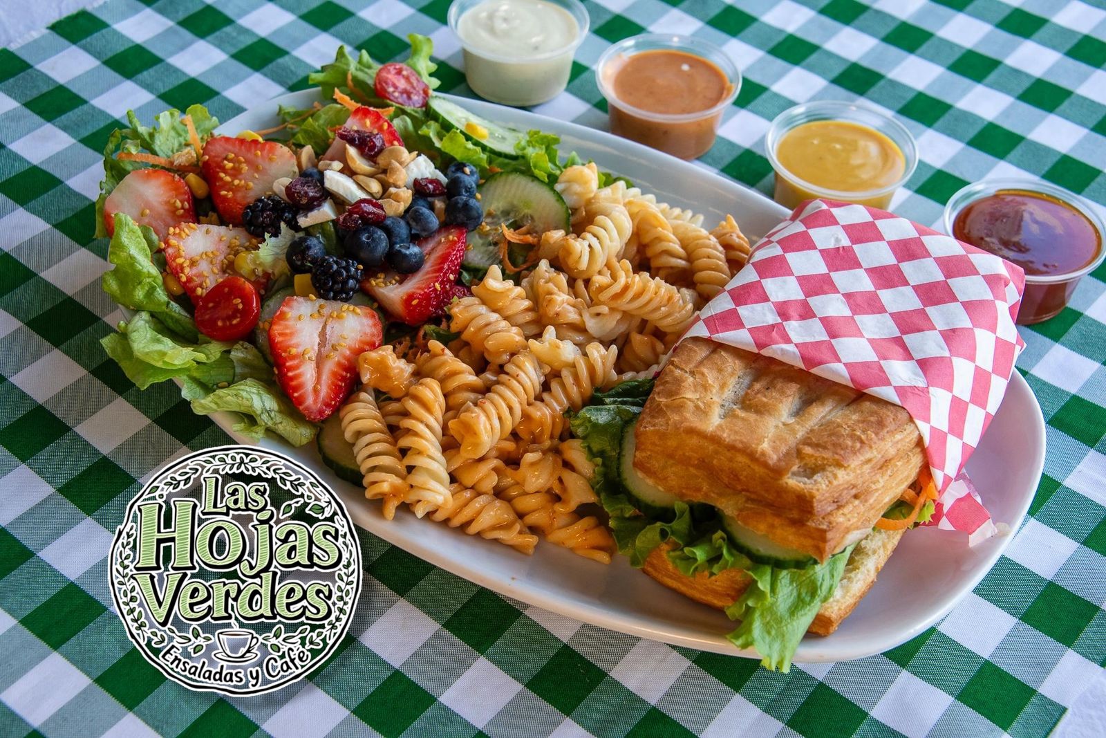 Fresas, BlueBerrys, Zarzamoras y Frambuesa. Lechuga romana,lechuga italiana,jamón de pavo,queso panela,pasta fussil,cacahuate tostado,arándanos,elote dorado,jitomate,pepino,cruton de pan de ajo,aderezo.