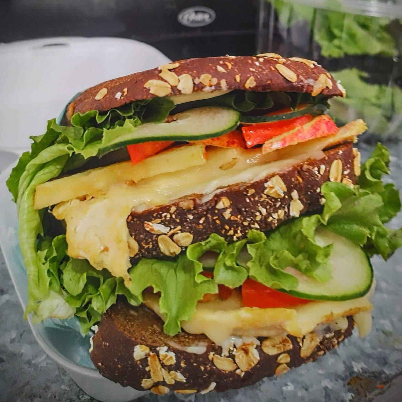 Emparedado doble de pechuga asada gratinada con queso manchego, manzana, pepino, lechuga italiana y jitomate. En un rico pan de centeno con avena tostado.