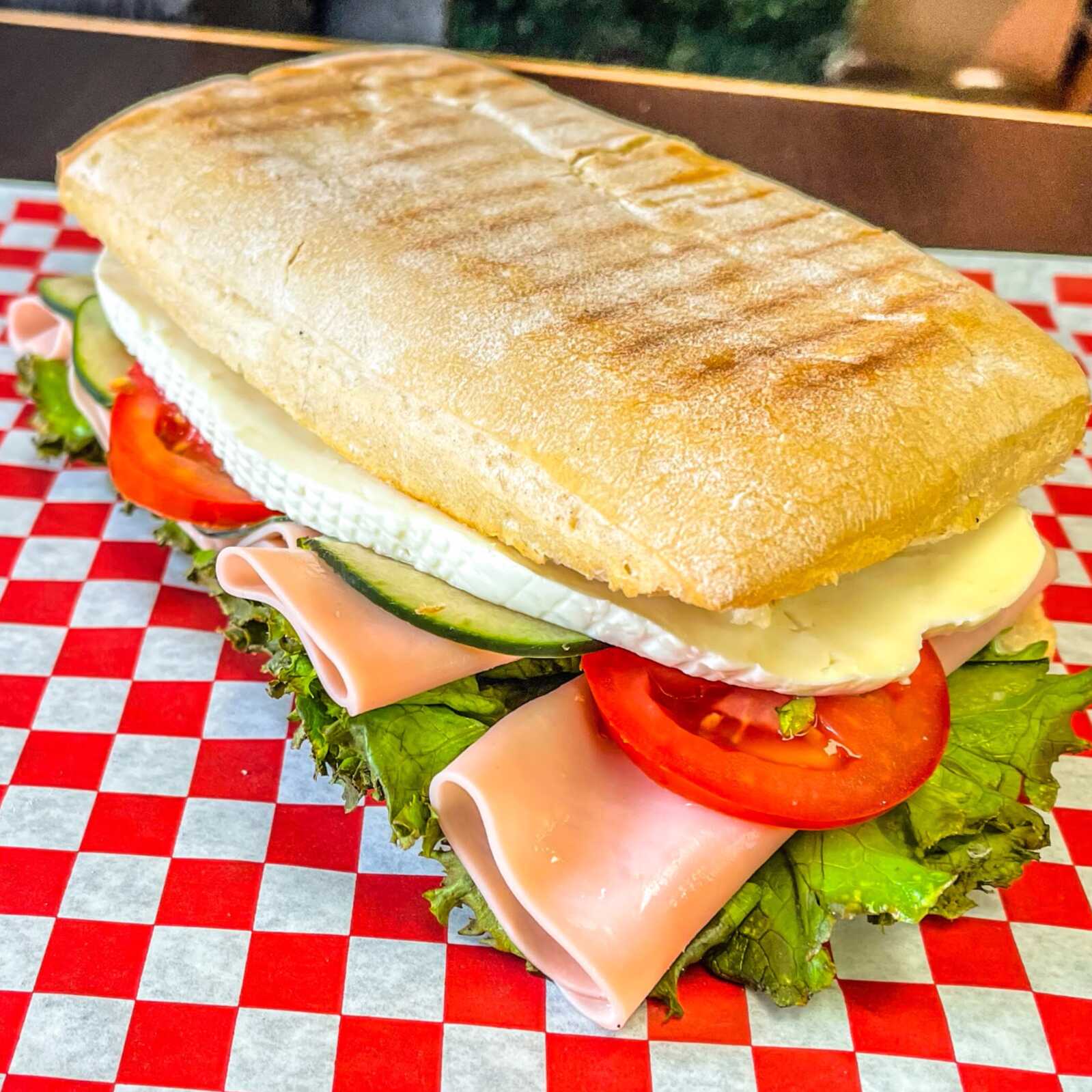 Chapata grande, con jamón de pechuga de pavo, con queso panela ó queso manchego a elegir 1, lechuga italiana, pepino, jitomate, zanahoria, mayonesa y aderezos.