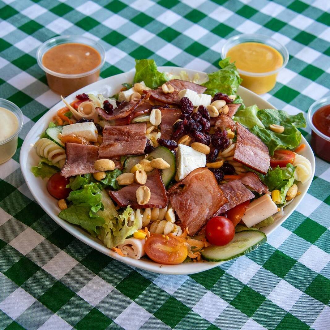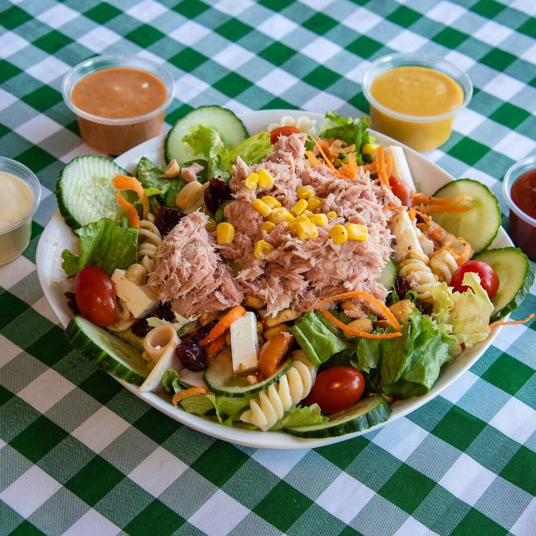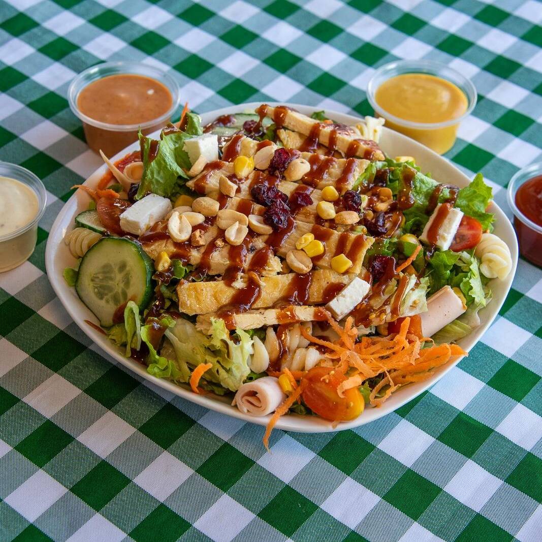 lechuga romana - Lechuga italiana - Jamón de pavo - Queso panela - Cacahuate tostado - Arándano - Elote dorado - Pasta fusil - Jitomate - Pepino - Zanahoria - Cruton de pan de ajo