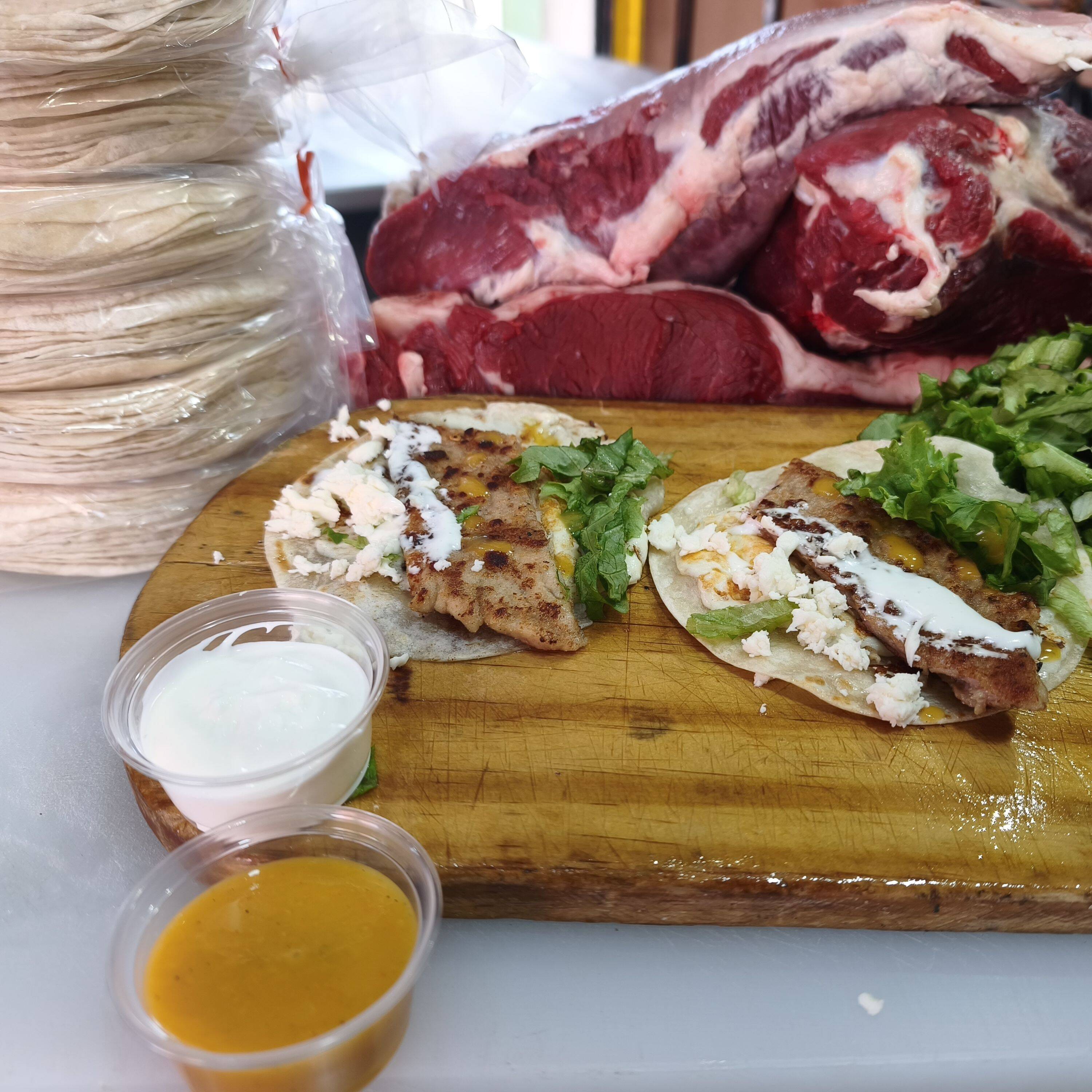 Pastor, Arrachera, cebolla, queso fundido y dos tortillas. (Porción personal)