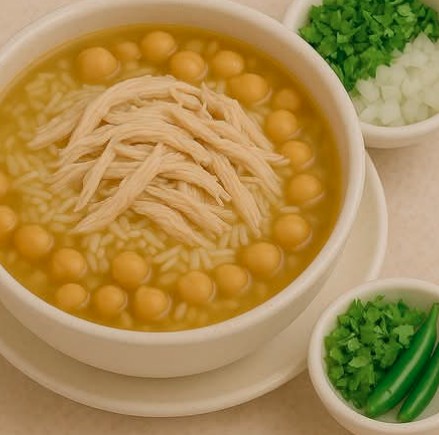 Con arroz, garbanzos, pechuga de pollo deshebrada.