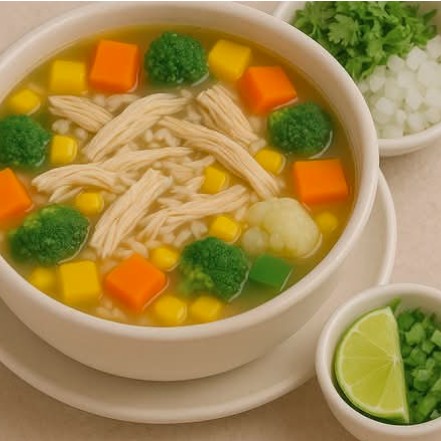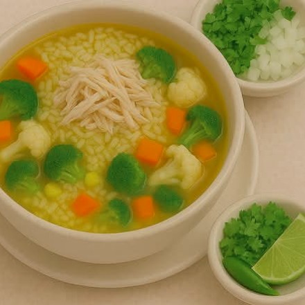 Consomé, arroz, mix de verduras, zanahoria, brócoli, coliflor y grano de elote, pechuga de pollo deshebrada.