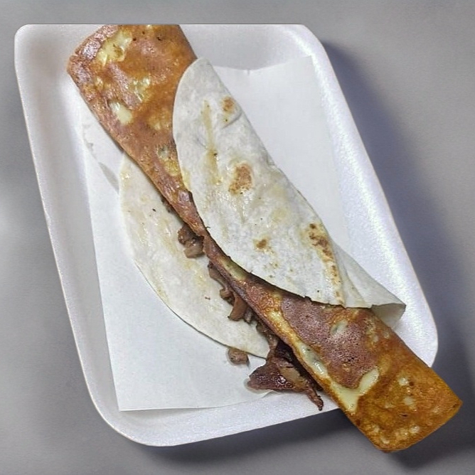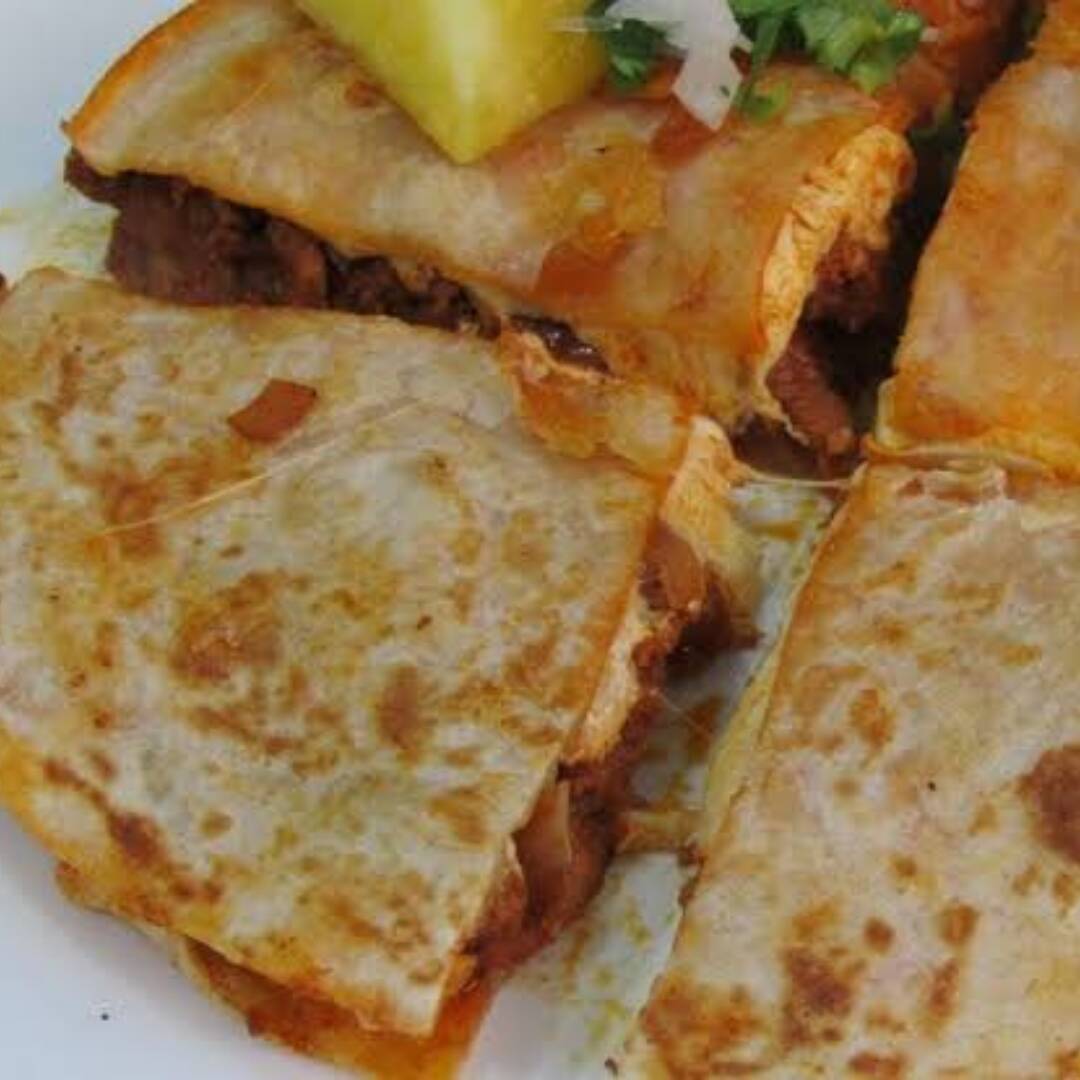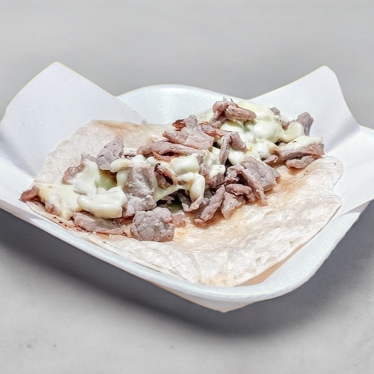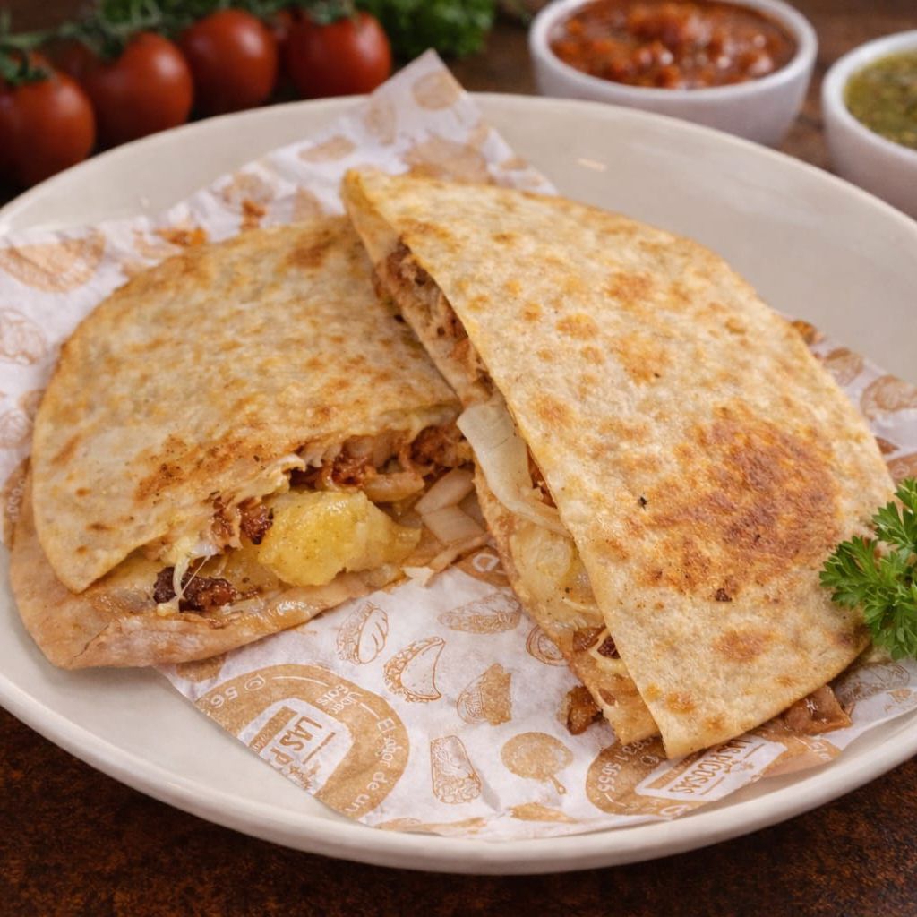 Doble tortilla de harina, bistec de res, queso manchego y cebolla.