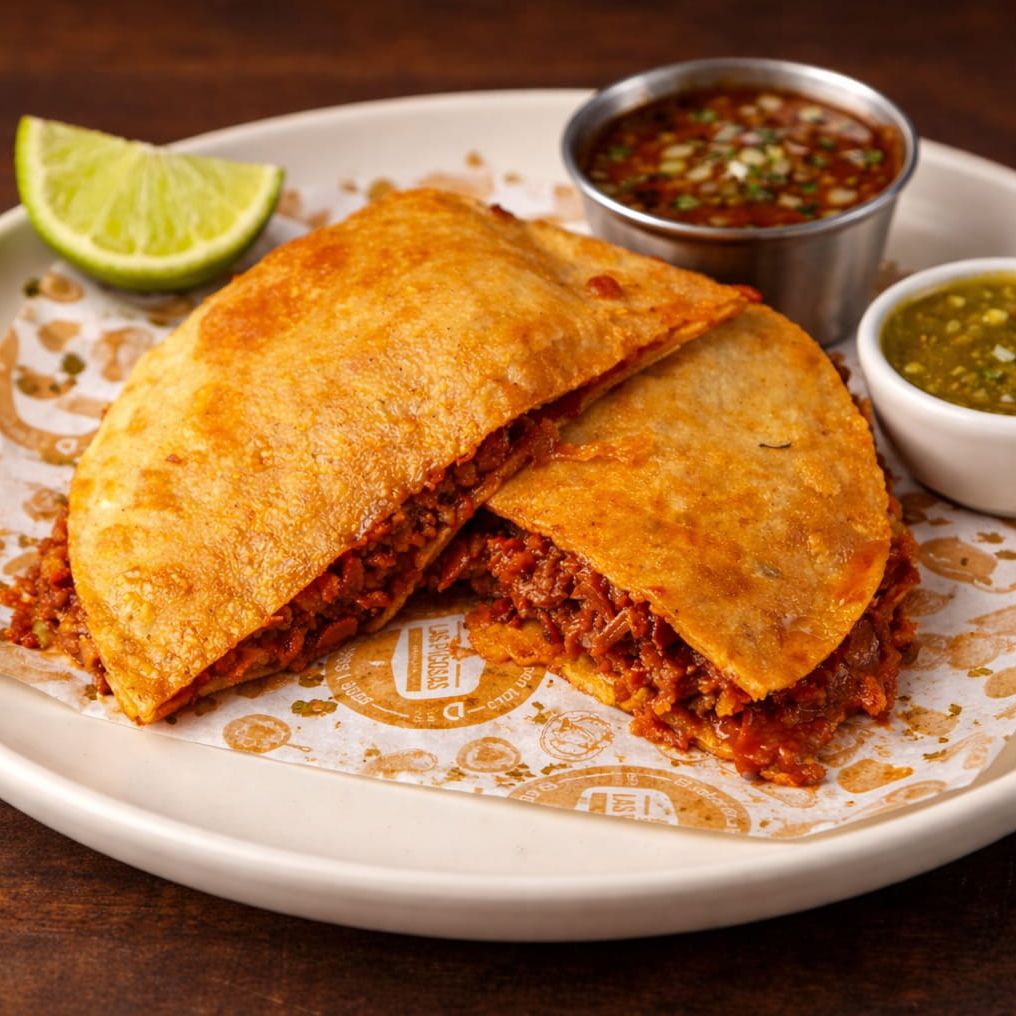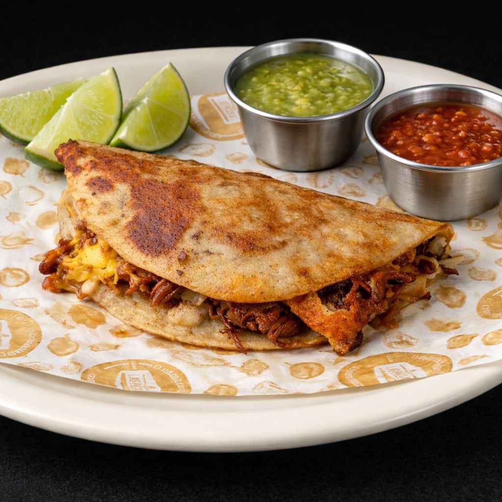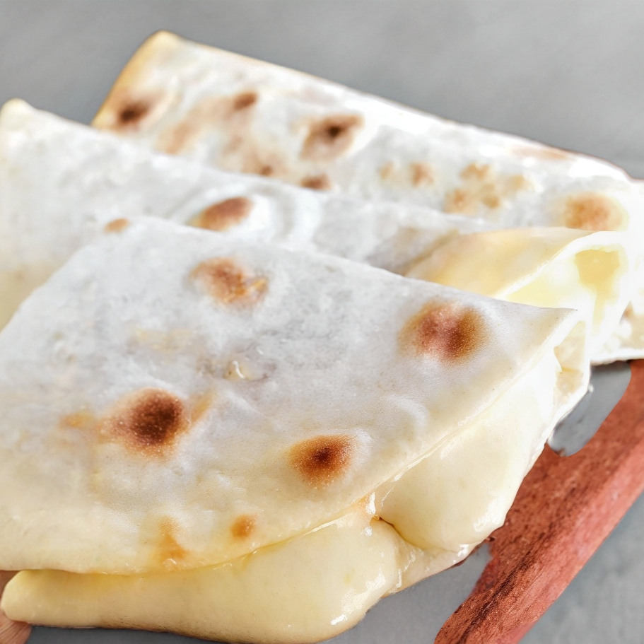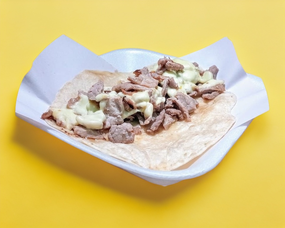 Doble tortilla de harina, bistec de res, queso manchego y cebolla.