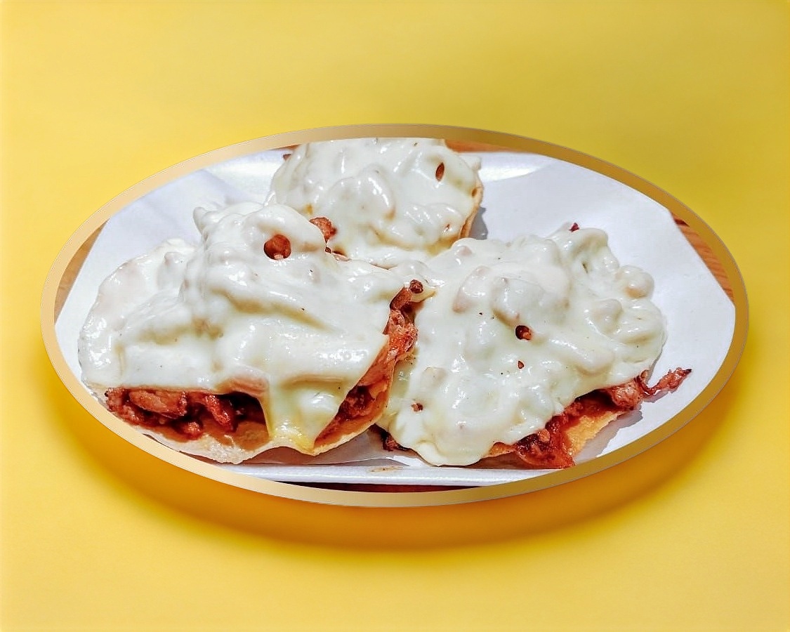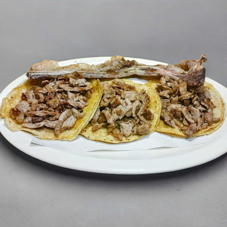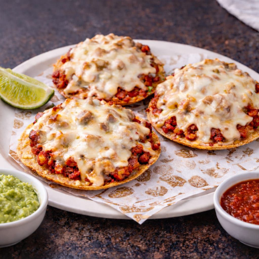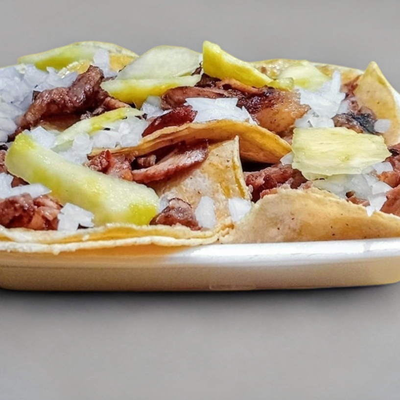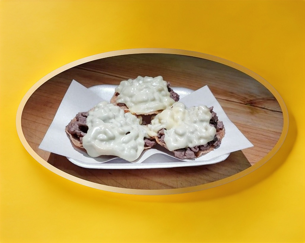 3 Piezas. Tostadas de maíz, bistec y queso manchego derretido.