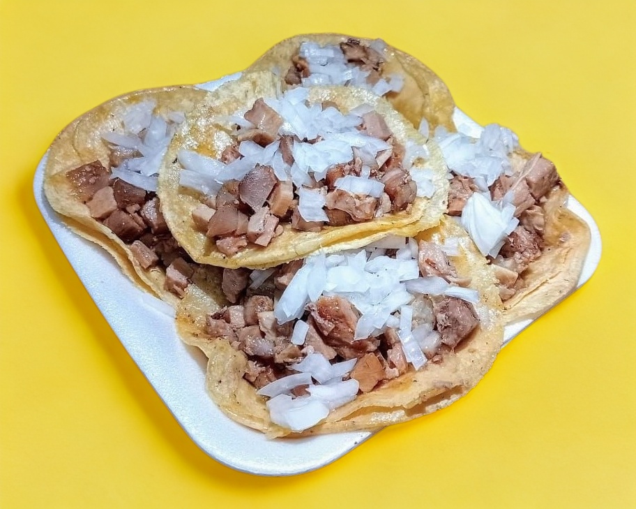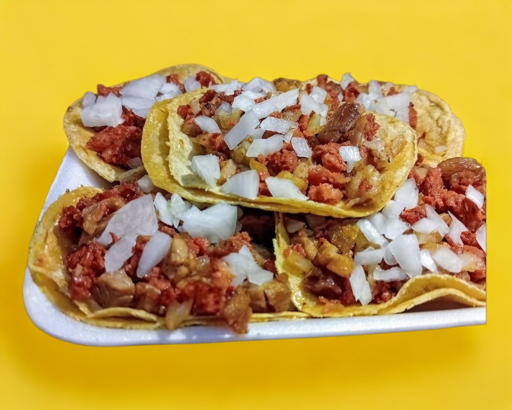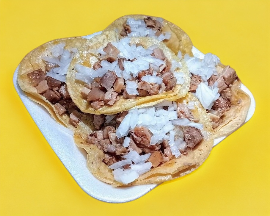 Suadero, longaniza, tortilla de maíz y cebolla.
