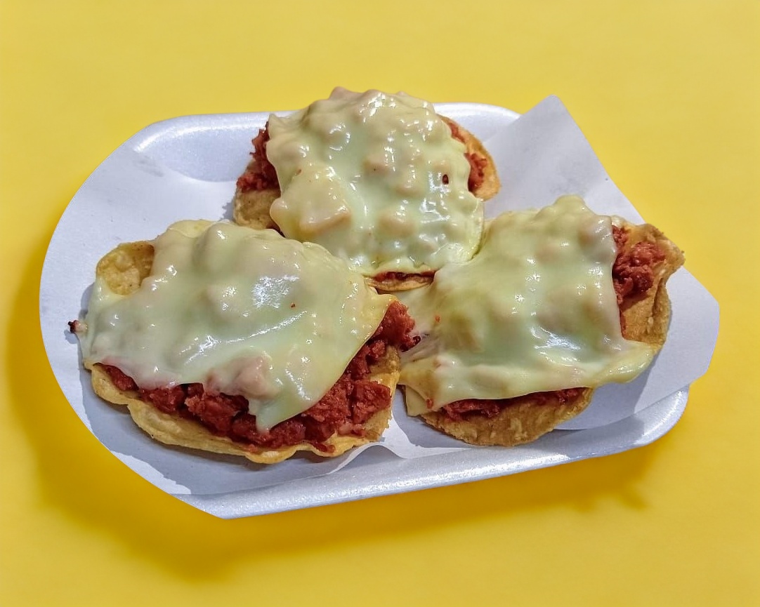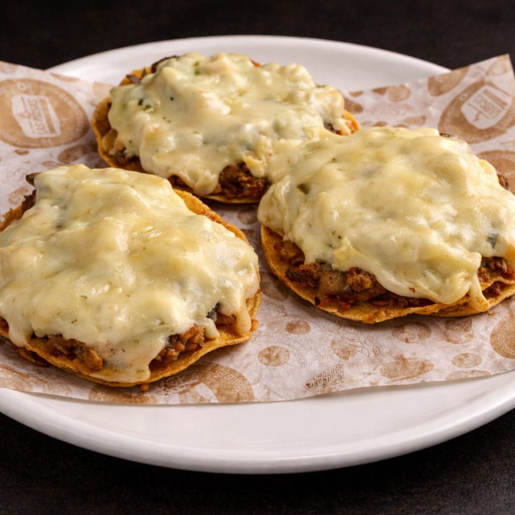 3 Piezas. Tostadas de maíz, suadero y queso manchego derretido.