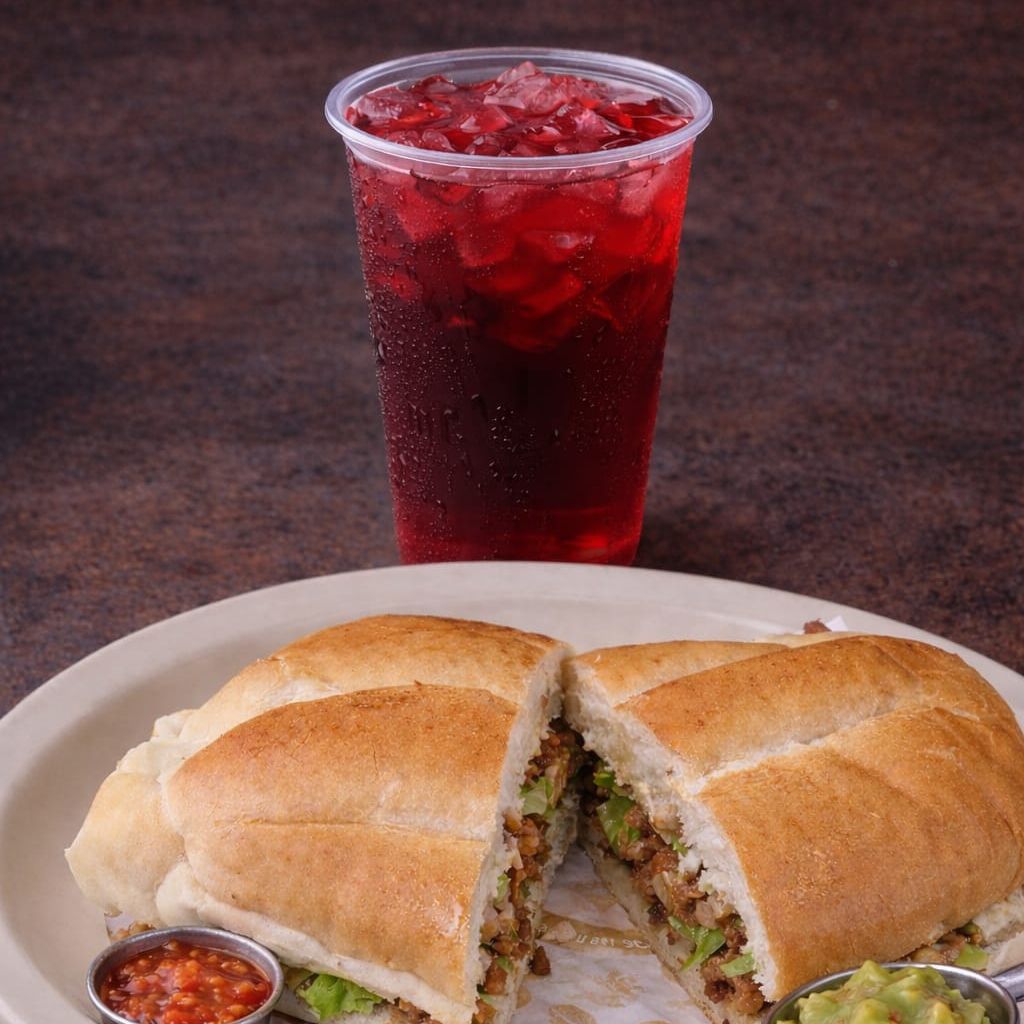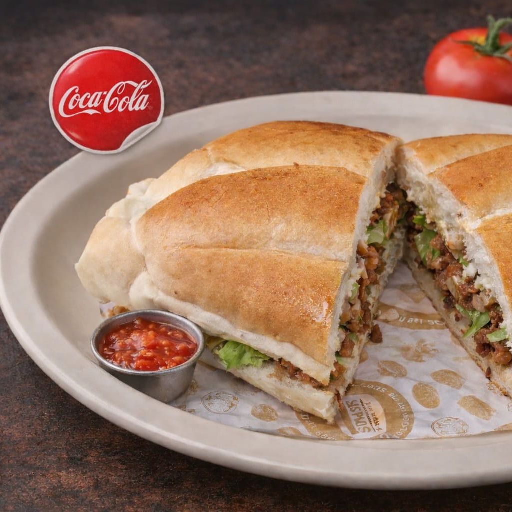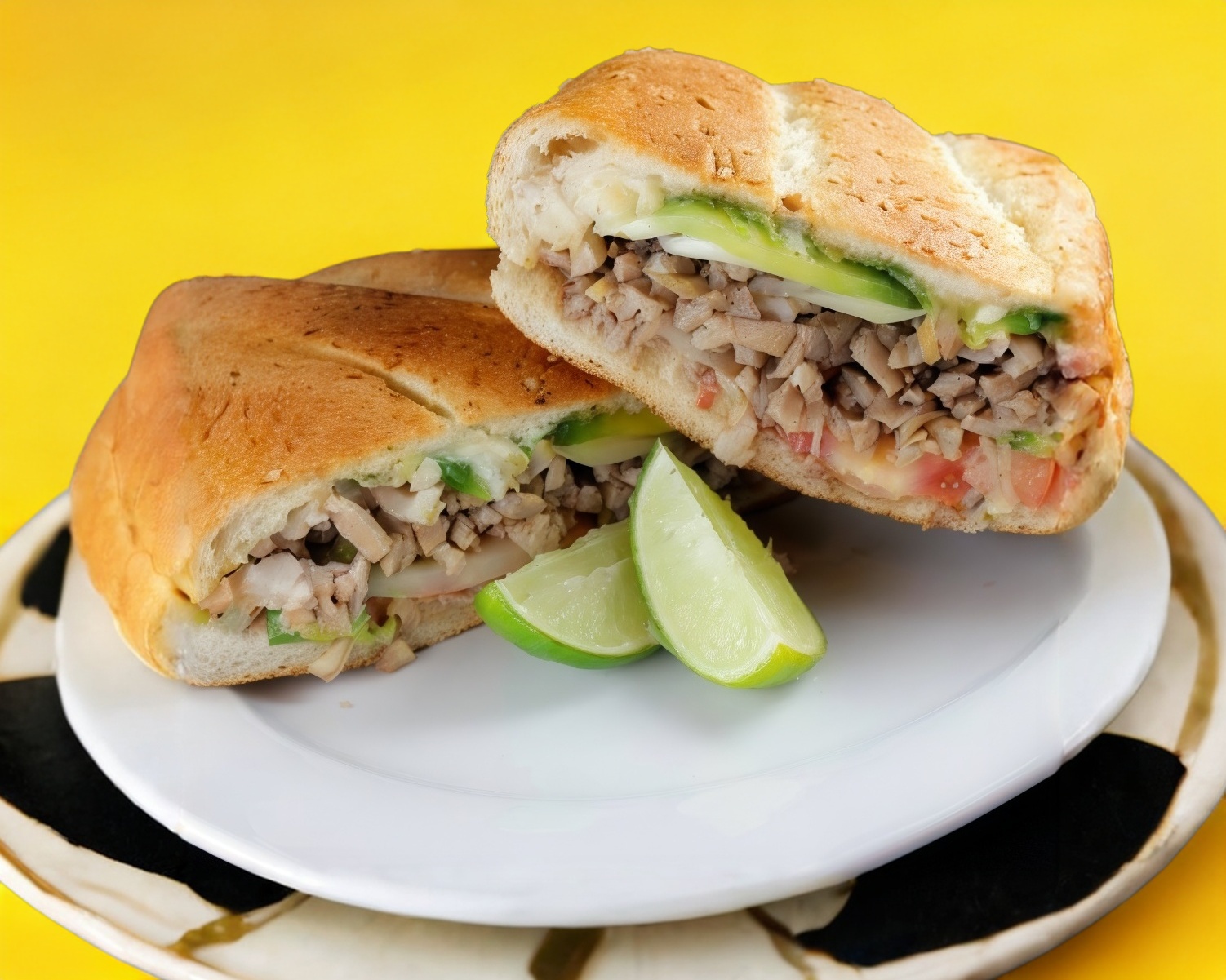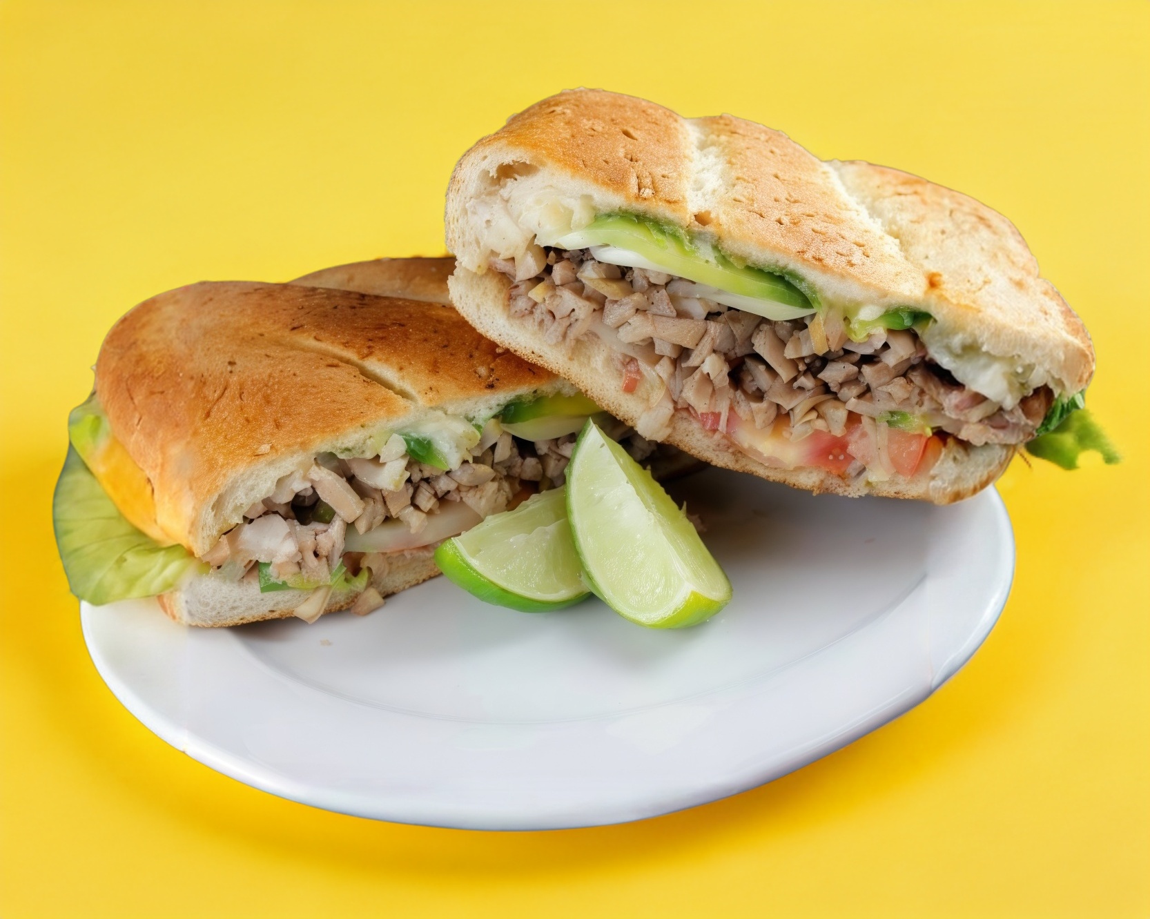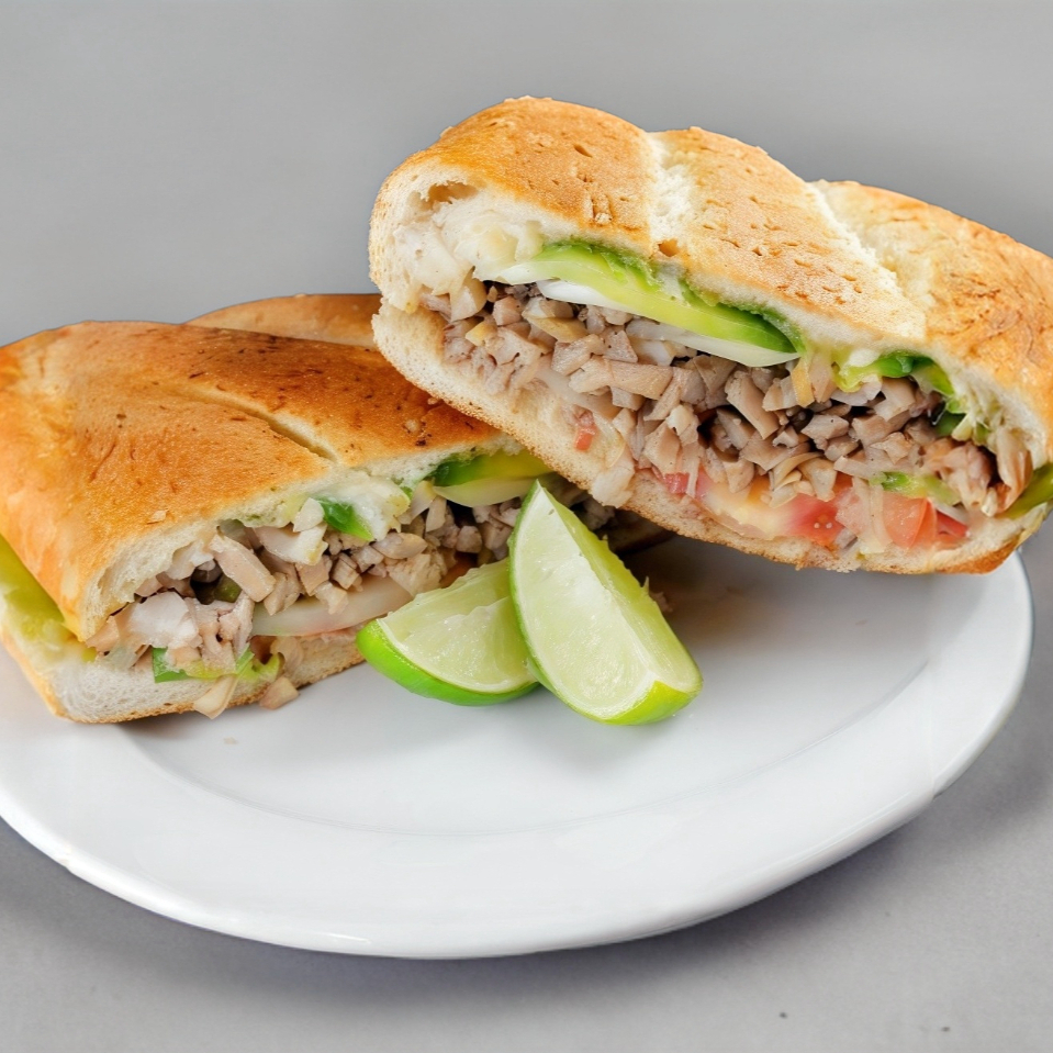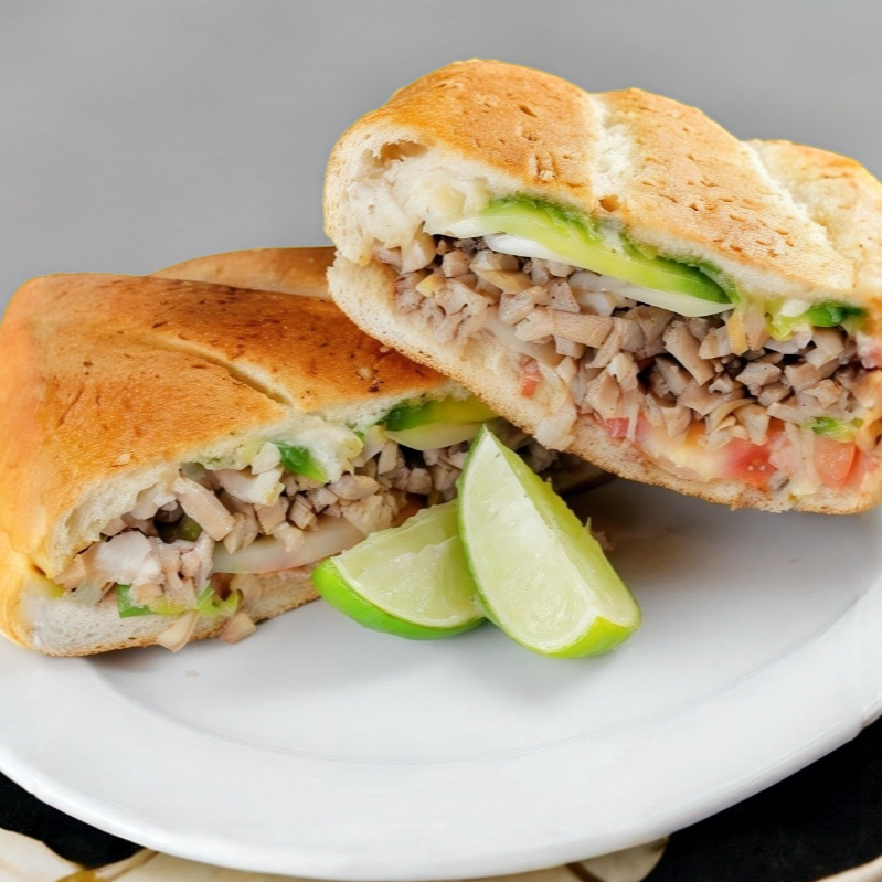 Telera grande preparada con mayonesa cebolla piña aguacate queso manchego y carne al pastor
