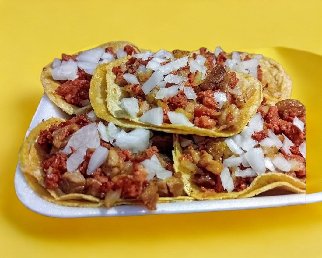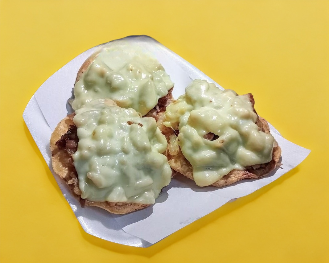 3 Piezas. Tostada de maíz, longaniza queso manchego derretido.