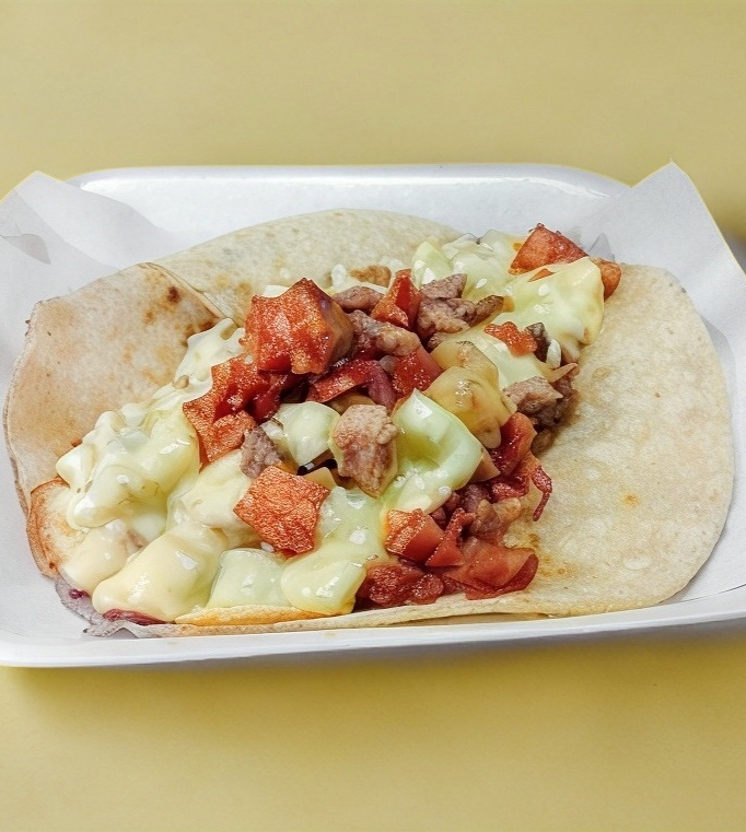 Queso dorado en la plancha cubierto con tortilla de harina y relleno de carne al pastor.