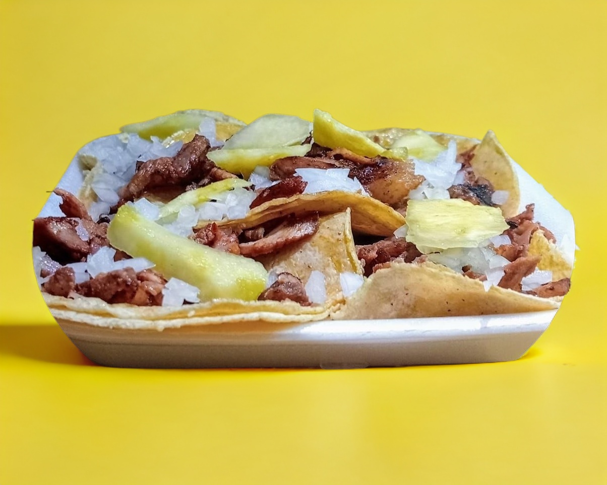 Doble tortilla de harina con 90 g de carne al pastor, 30 g de queso manchego, cebolla y piña, ya repartidos.