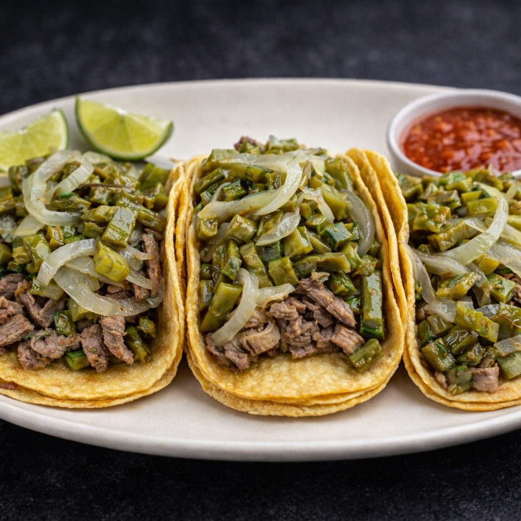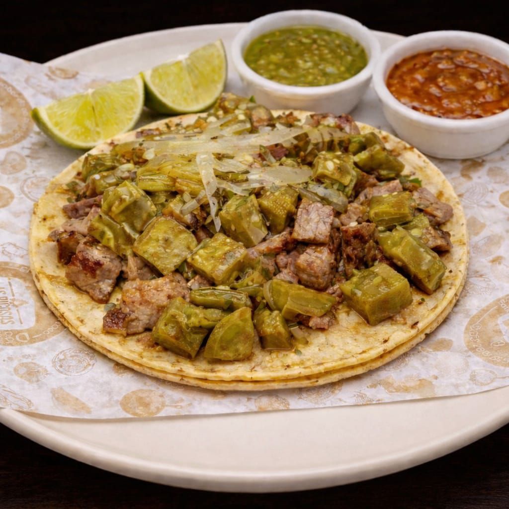 Tacos de bistec en tortilla grande con nopales con cebolla
