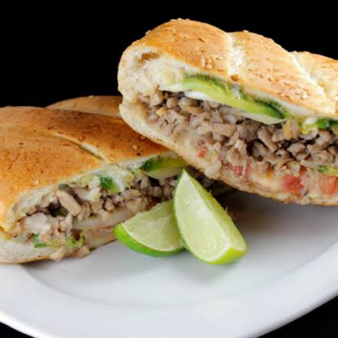 Telera grande preparada con mayonesa aguacate cebolla ,queso manchego y bistec de res