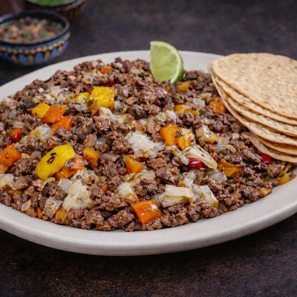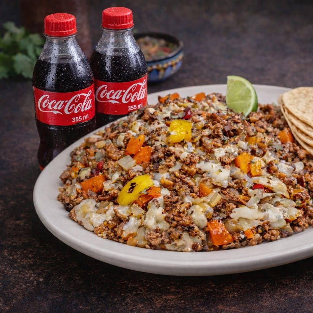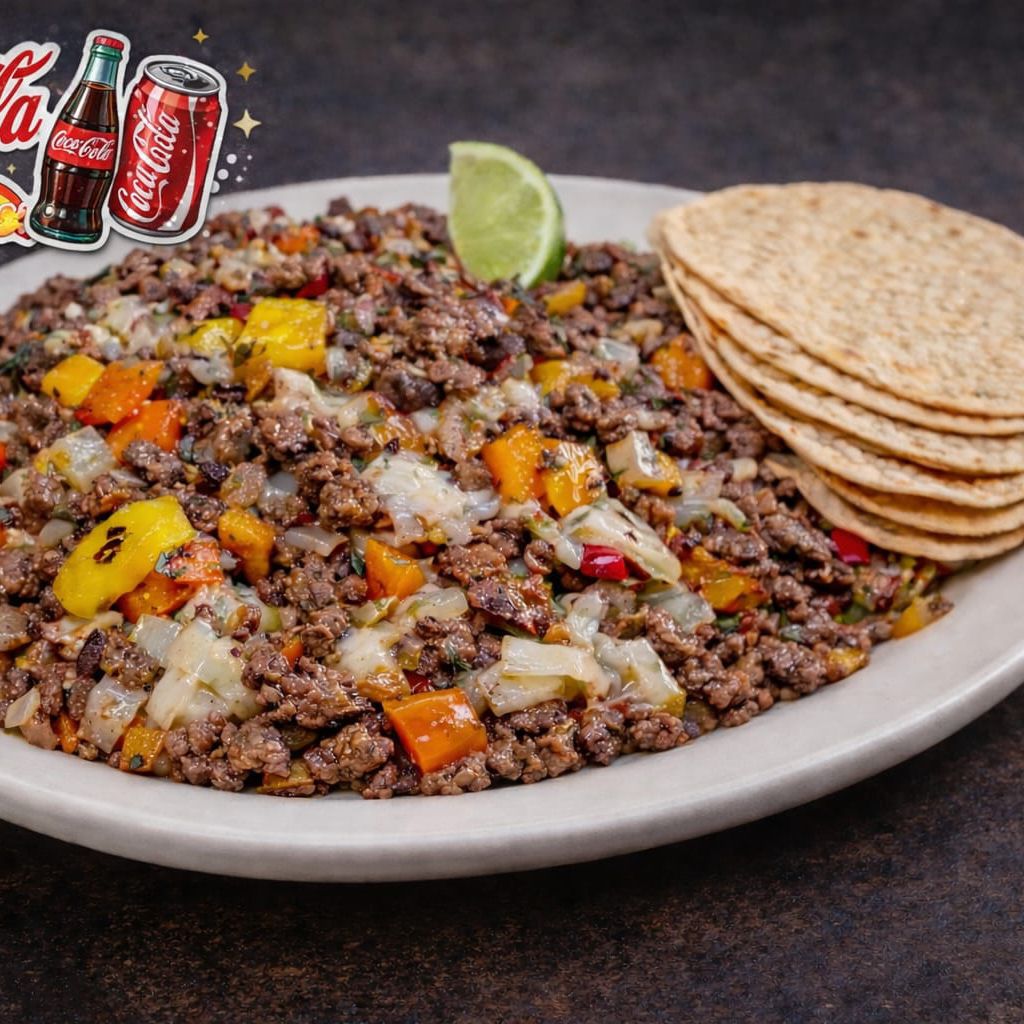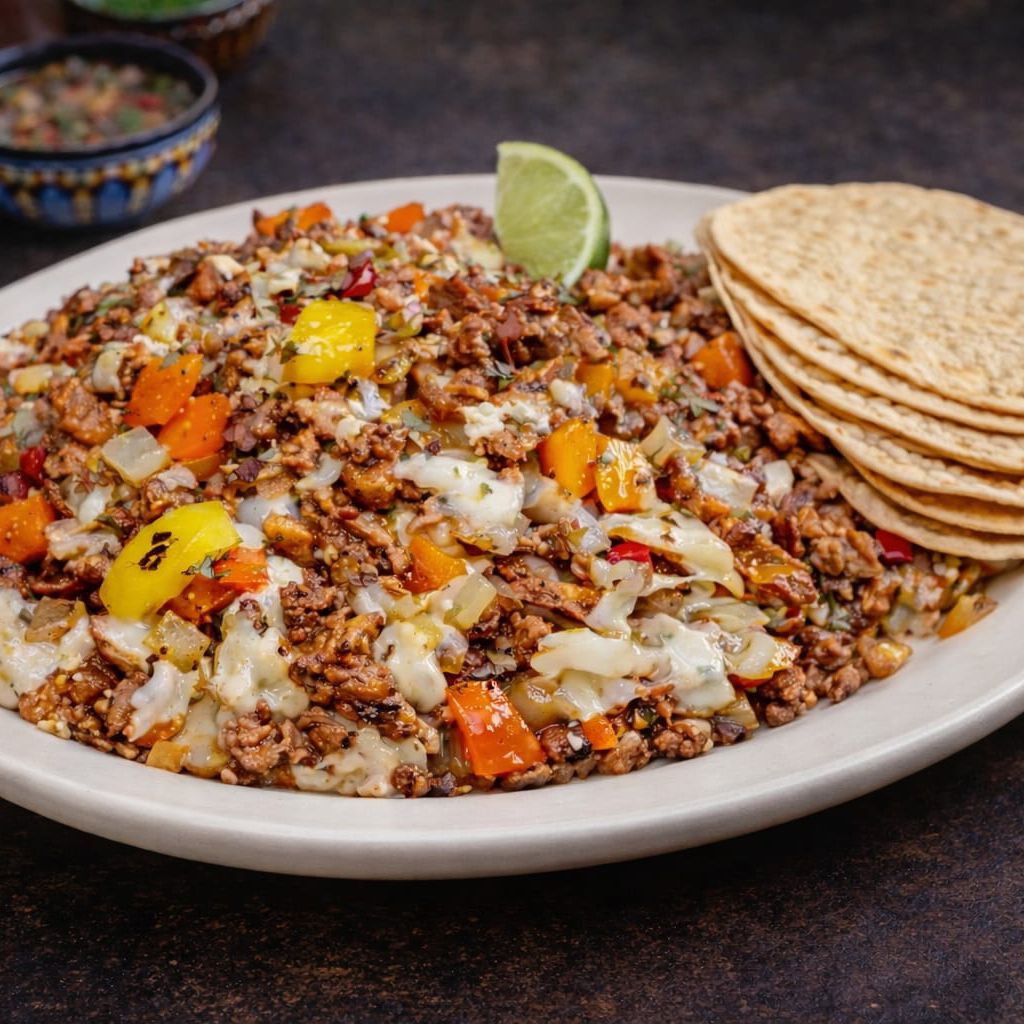 Suadero suave y bien dorado, mezclado con morron, cebolla salteada y queso manchego fundido. Incluye 25 tortillas de maíz. Sabor intenso y textura jugosa en cada bocado.