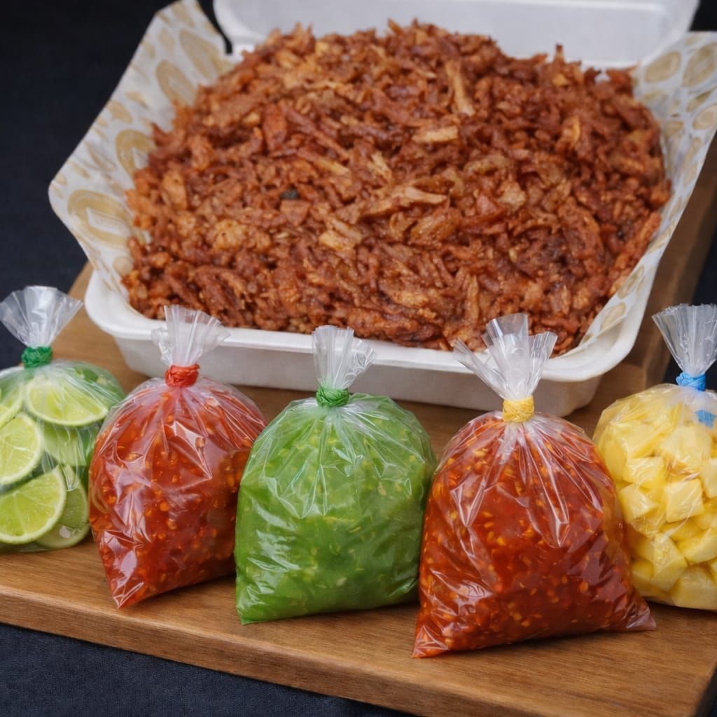 Carne al pastor jugosa y sazonada al trompo, combinada con morron, cebolla y queso manchego fundido. Incluye 25 tortillas de maíz calientes. Porción abundante de 600 gramos , ideal para compartir.
