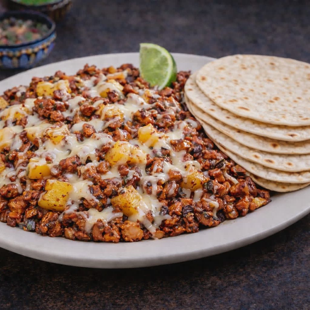 Deliciosa combinación de carne al pastor jugosa,mezclada con piña asada y queso manchego fundido, creando un equilibrio perfecto entre lo dulce y lo salado. Acompañado de 6 tortillas de harina calientes listas para armar tu taco.