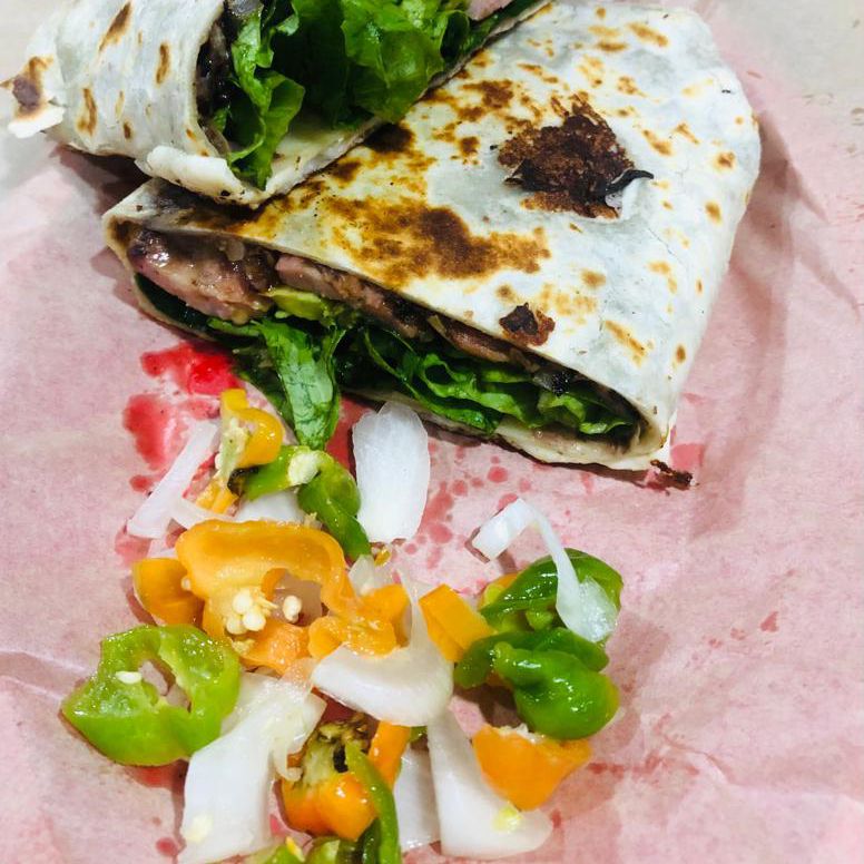 Platillo personal: Tortilla de harina. Lleva frijoles, jitomate, cebolla, aguacate, queso, picante.