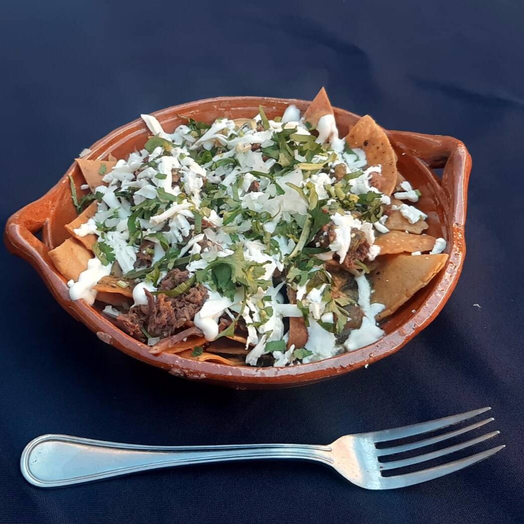 CHILAQUILES CON BIRRIA, QUESO, CREMA, CILANTRO
