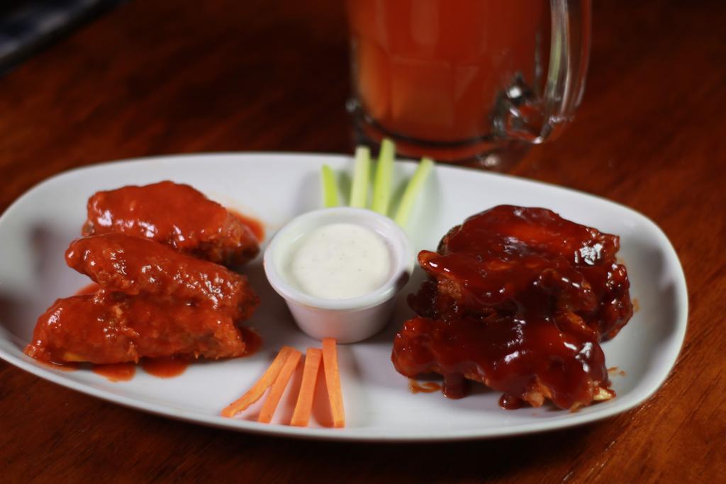 8 piezas de alitas de pollo con la salsa de tu elección: BBQ o Hot
