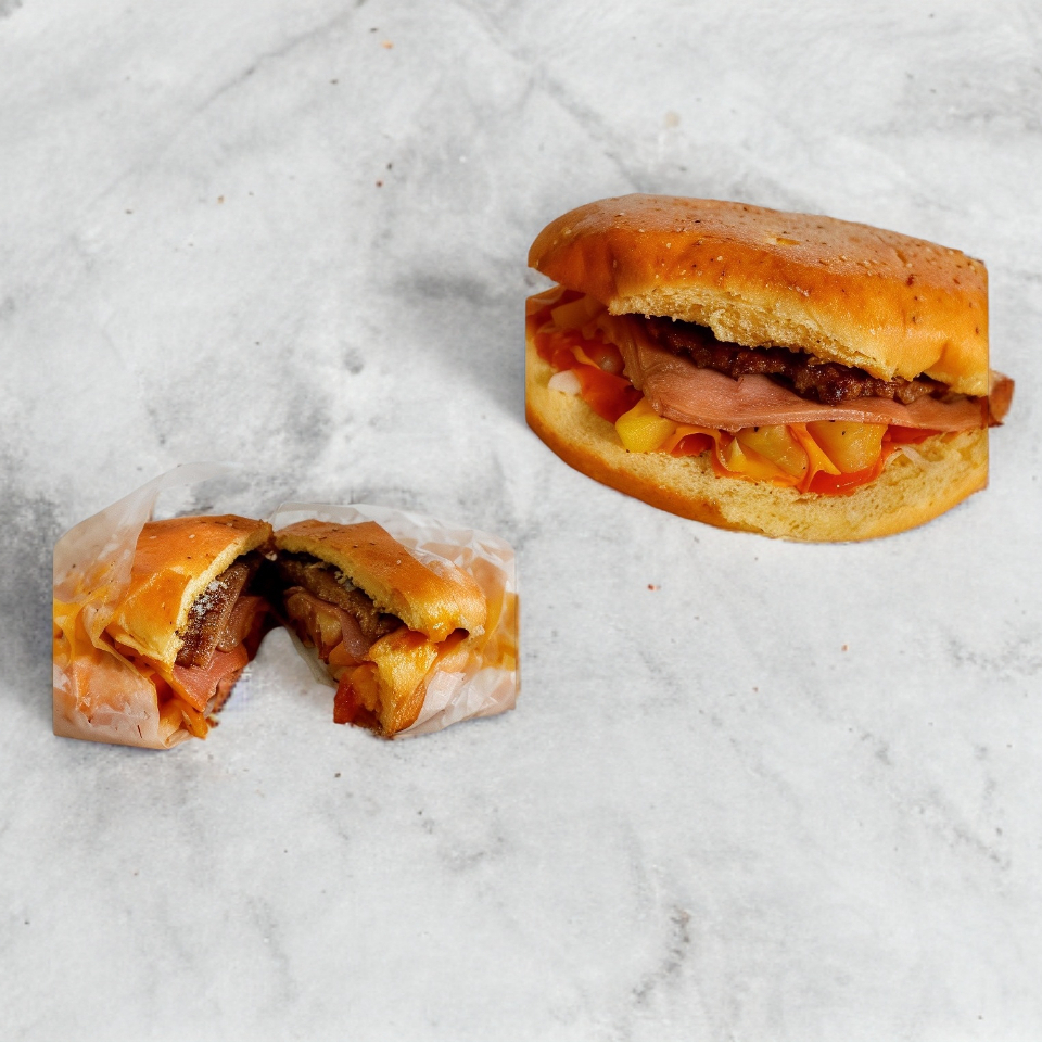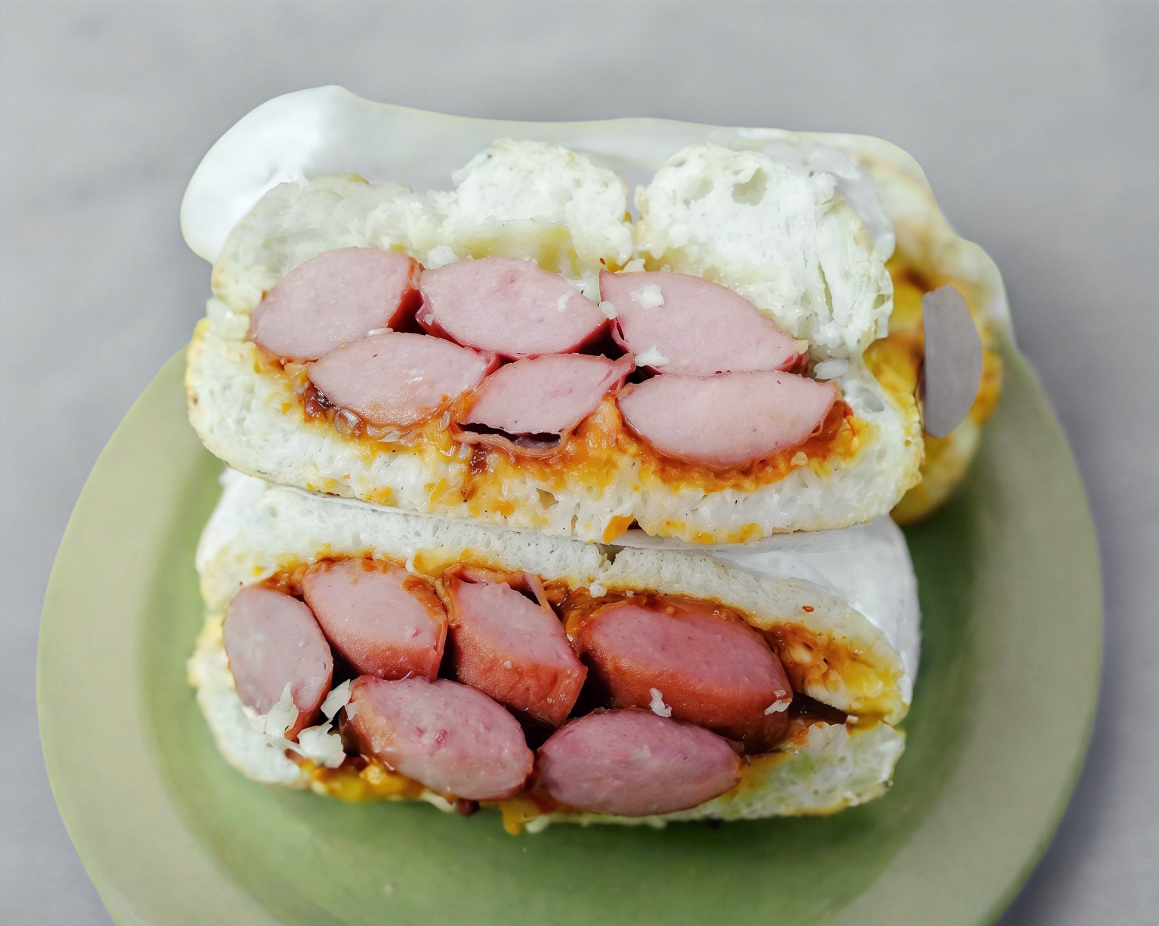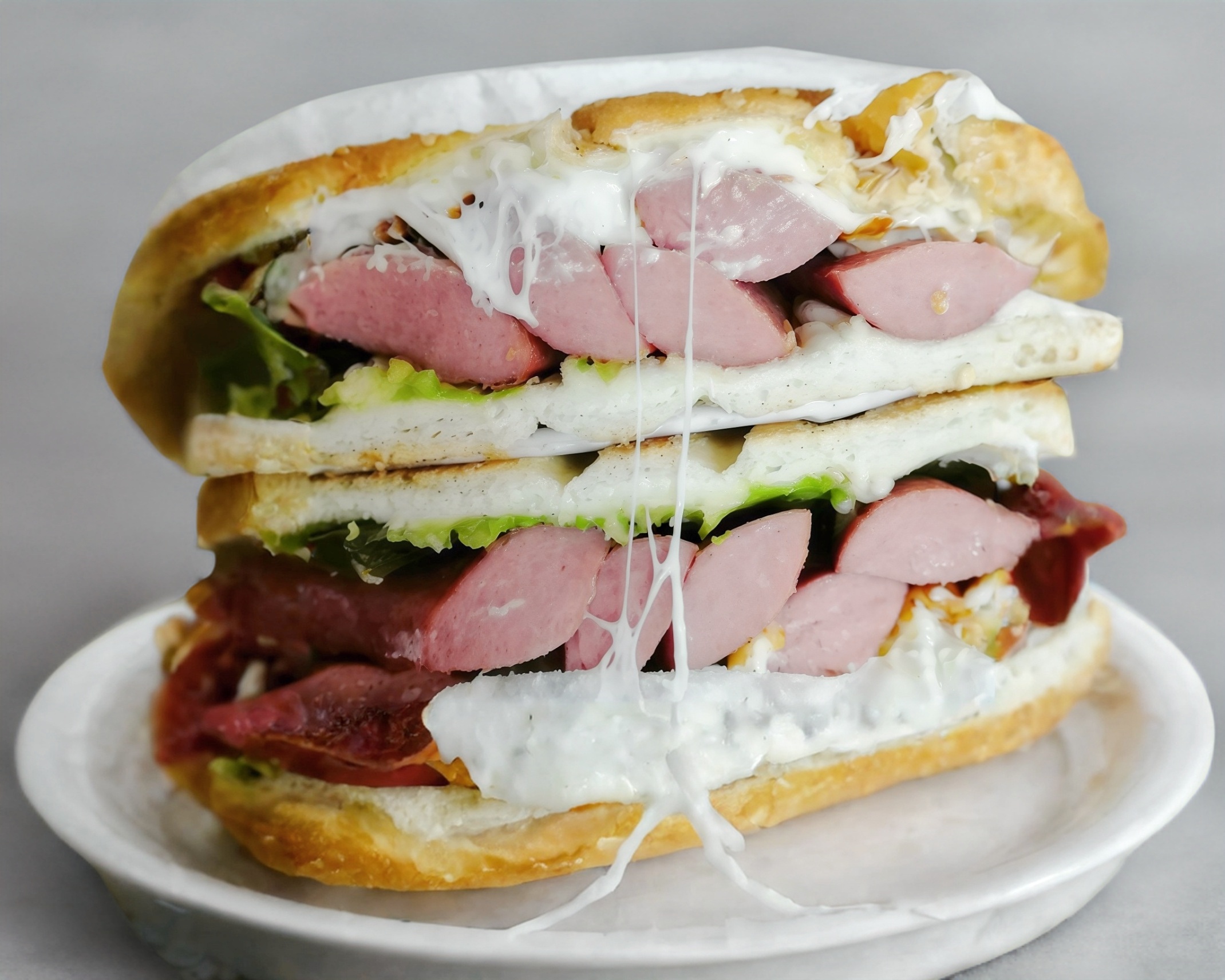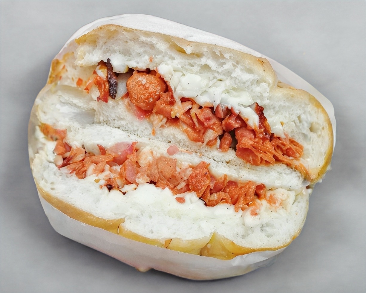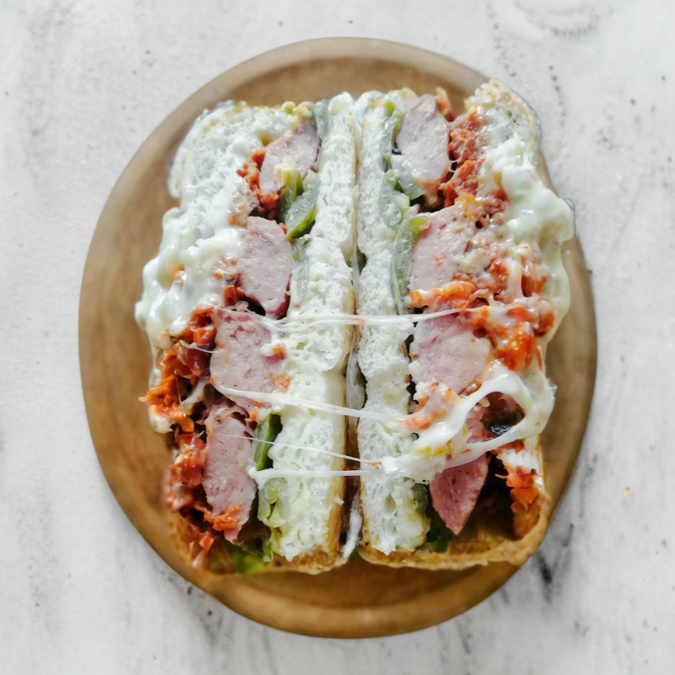 Telera doble con ajonjolí, milanesa, salchicha y quesillo.