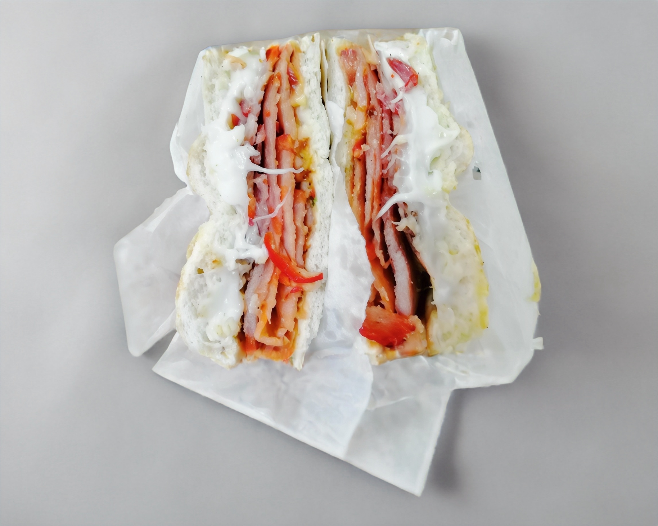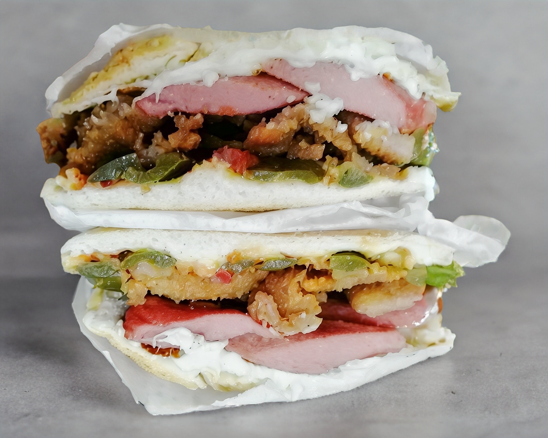 Telera doble con ajonjolí, milanesa de pollo empanizado, piña y quesillo.