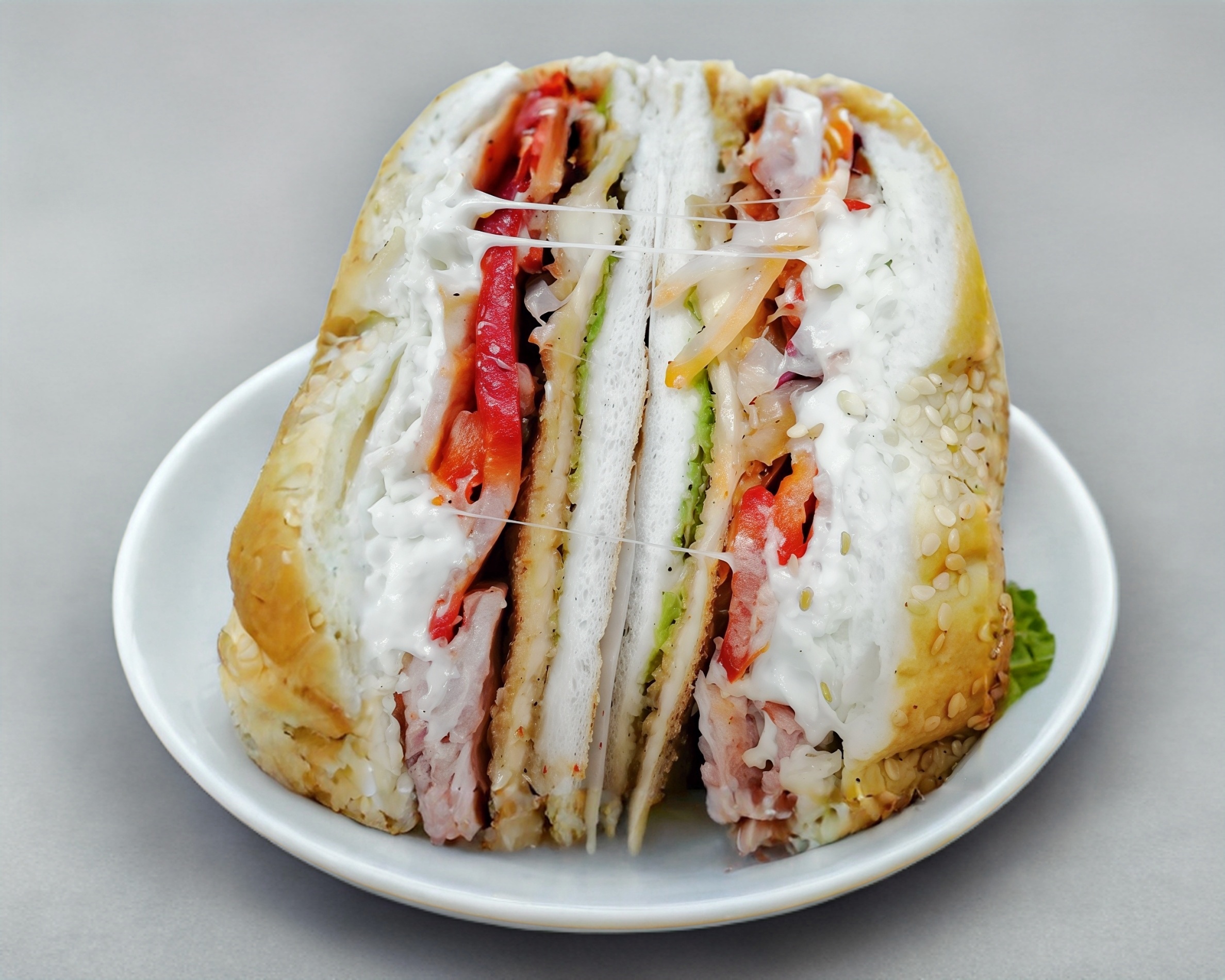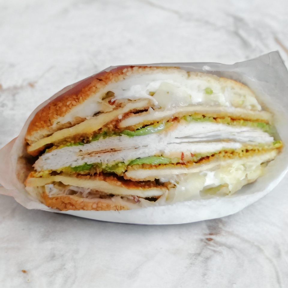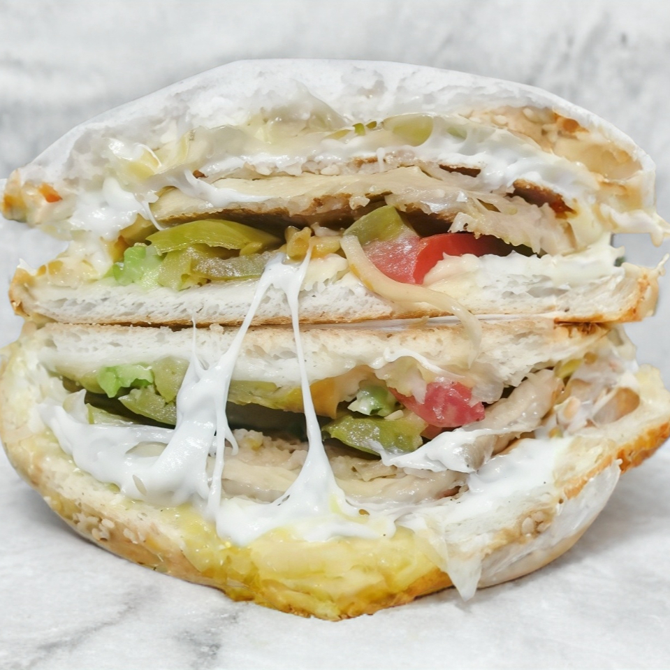 Telera doble con ajonjolí, milanesa de pollo empanizado, queso amarillo y quesillo.