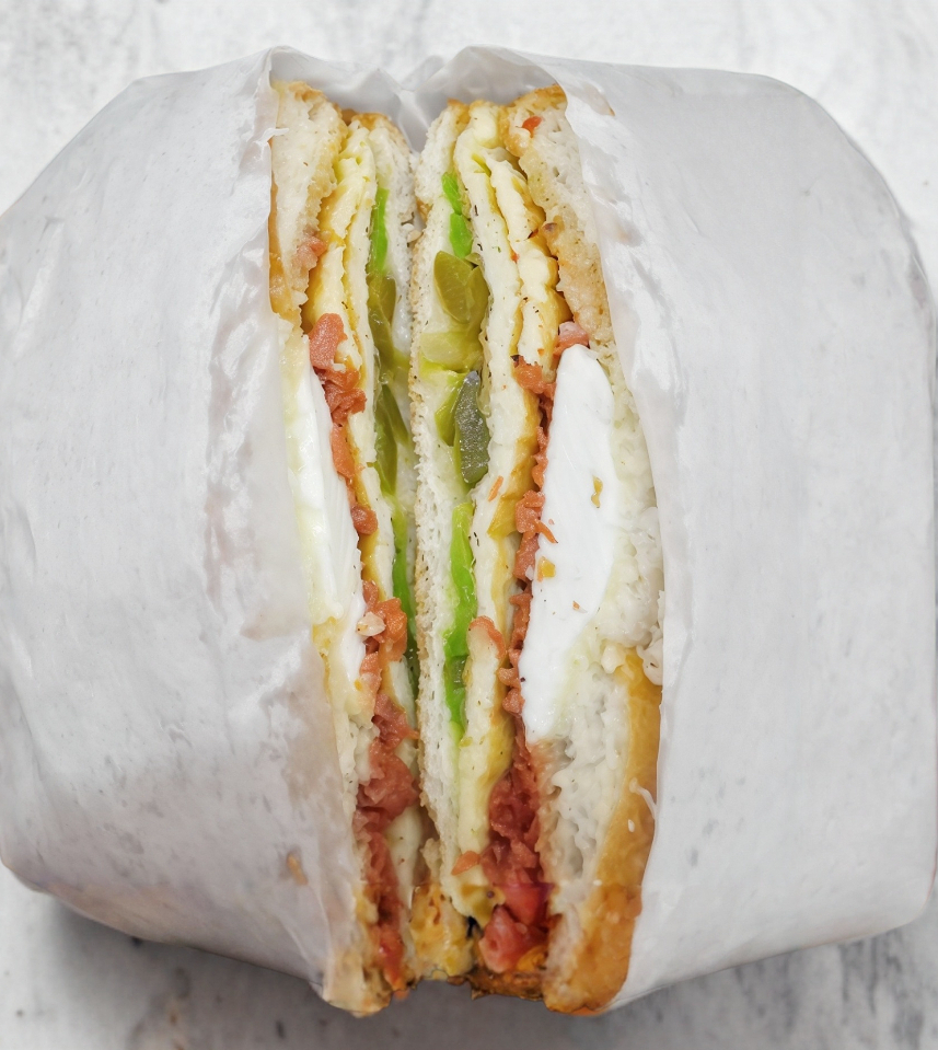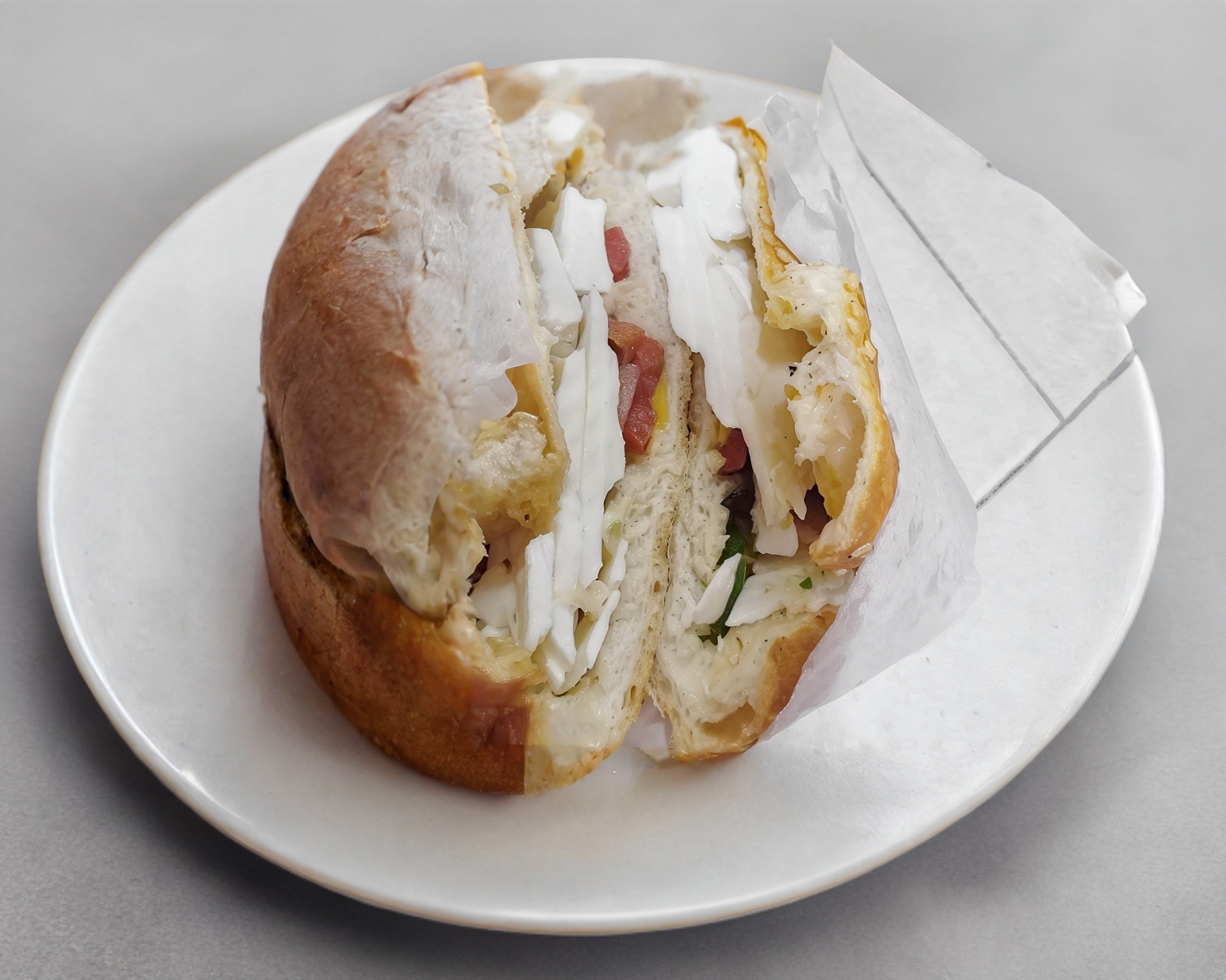 Telera doble con ajonjolí, 2 huevos y chorizo.