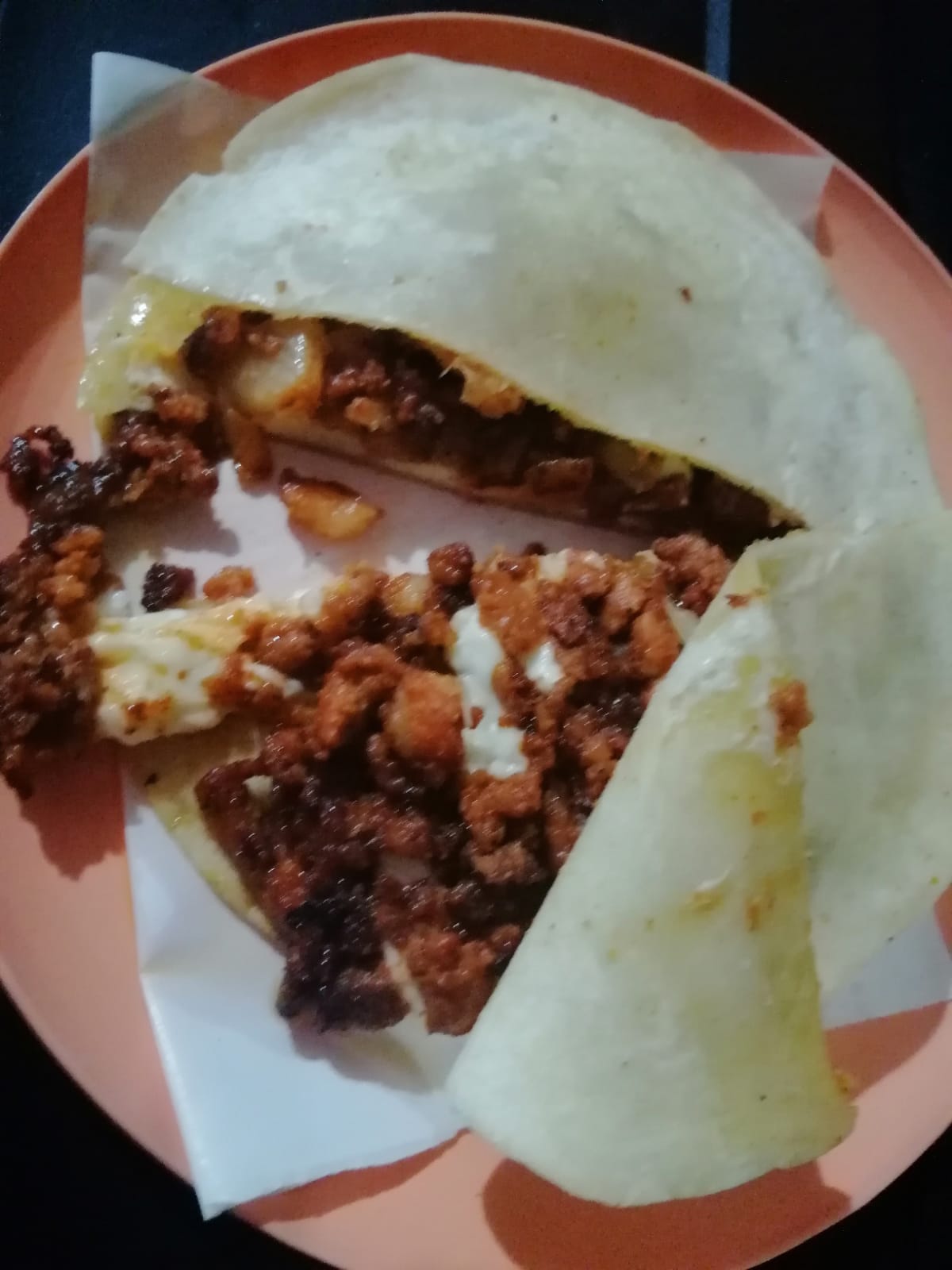 2 Tortillas de harina, carne al pastor y quesillo.