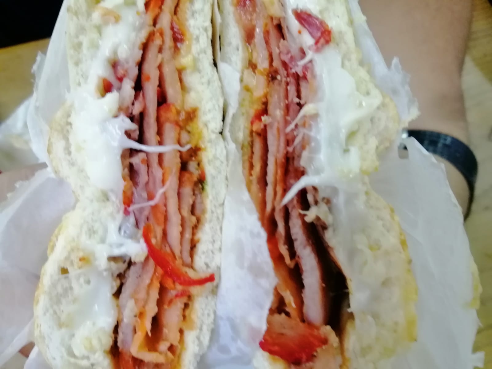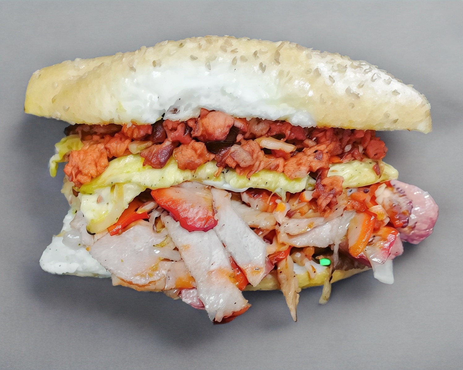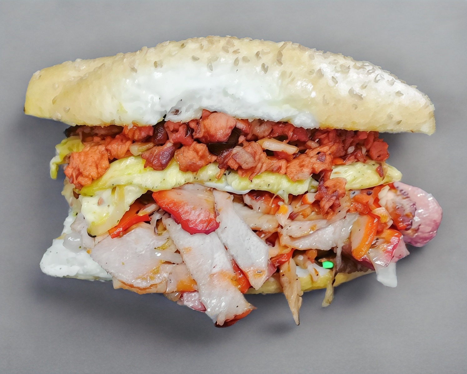 Telera doble con ajonjolí, carne al pastor y quesillo.