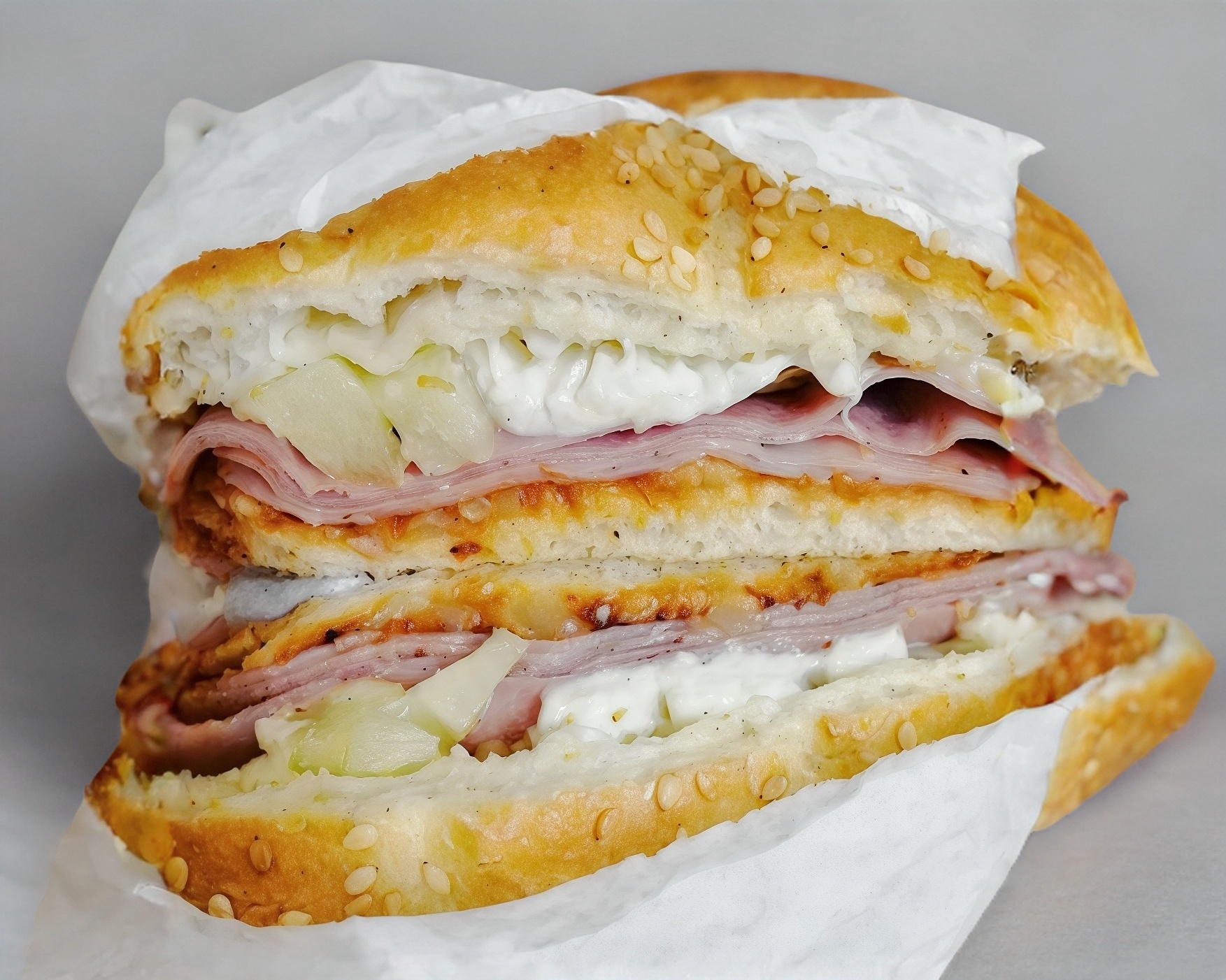 Telera doble con ajonjolí, 4 rebanadas de jamón, piña y quesillo.