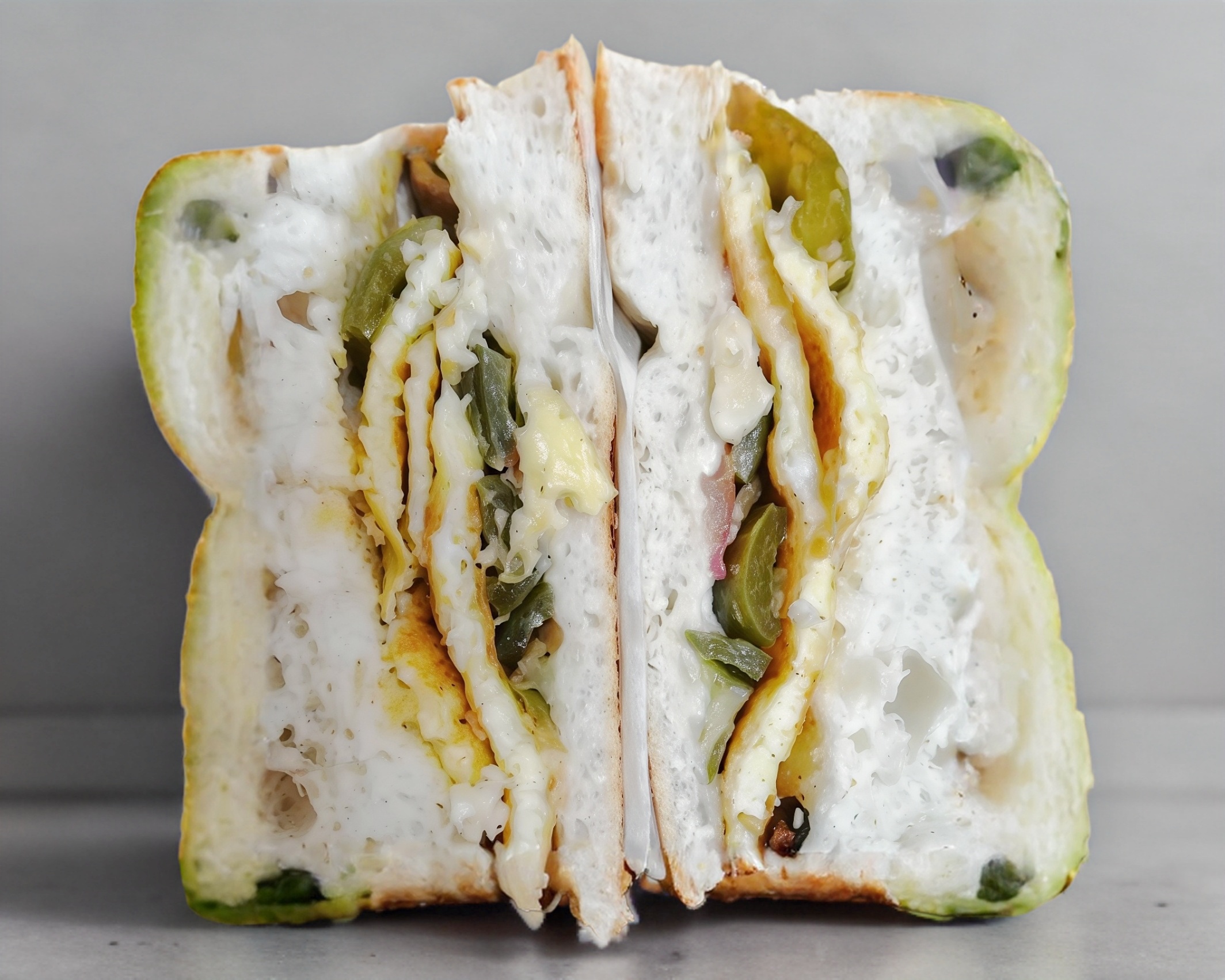 Telera doble con ajonjolí, milanesa de pollo empanizado, pierna española y quesillo.