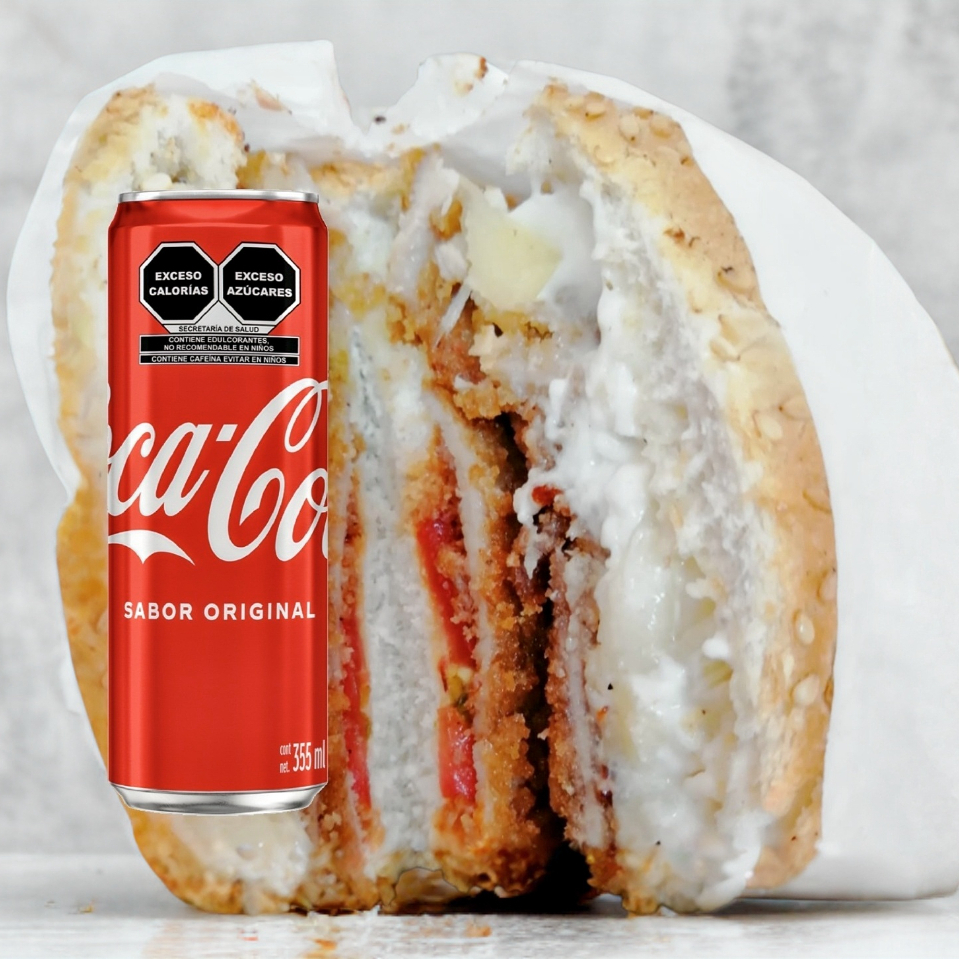 Telera doble con ajonjolí, milanesa de pollo empanizado, chuleta y quesillo.