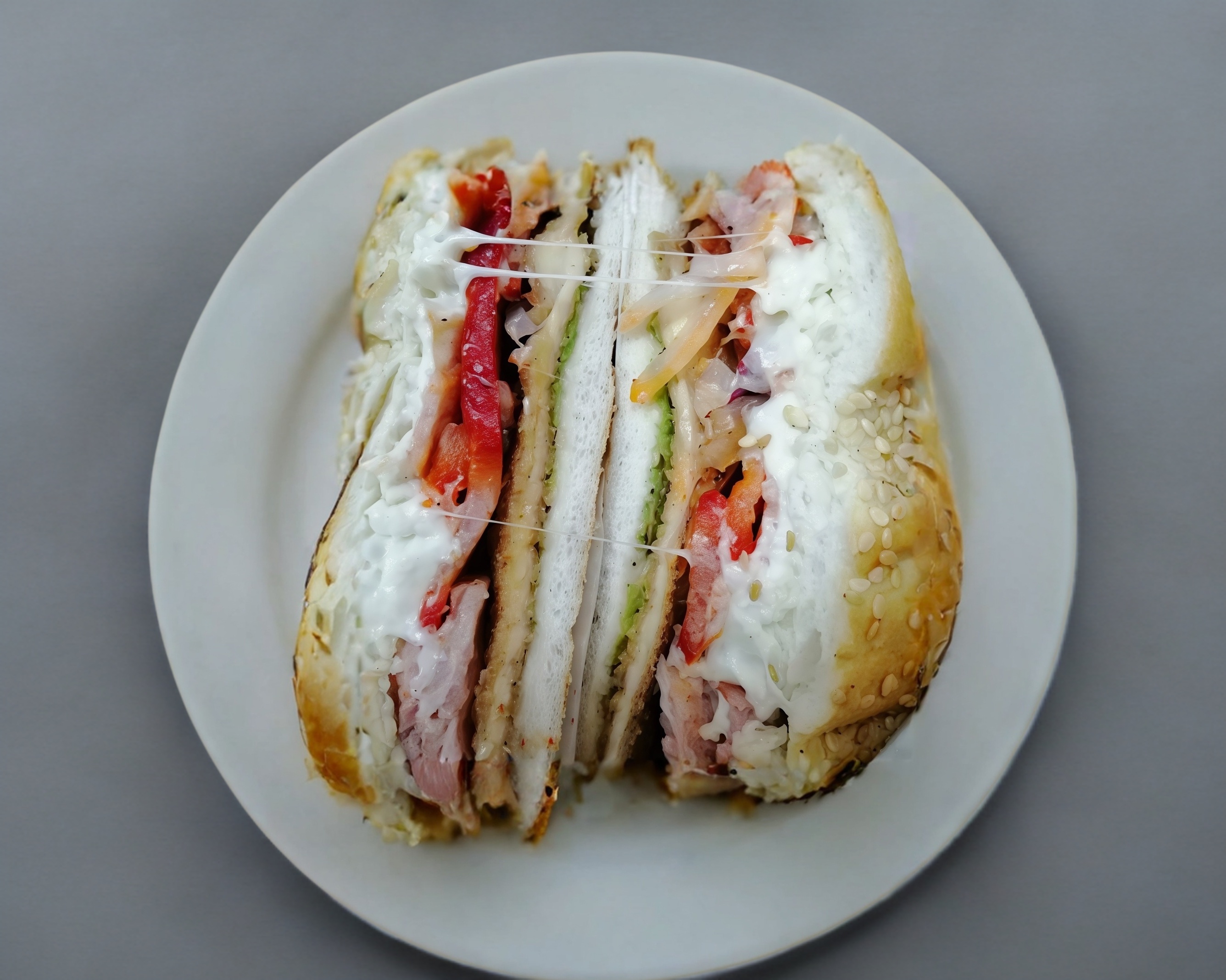 Telera doble con ajonjolí, 4 rebanadas de jamón, 3 rebanadas de queso amarillo y quesillo.