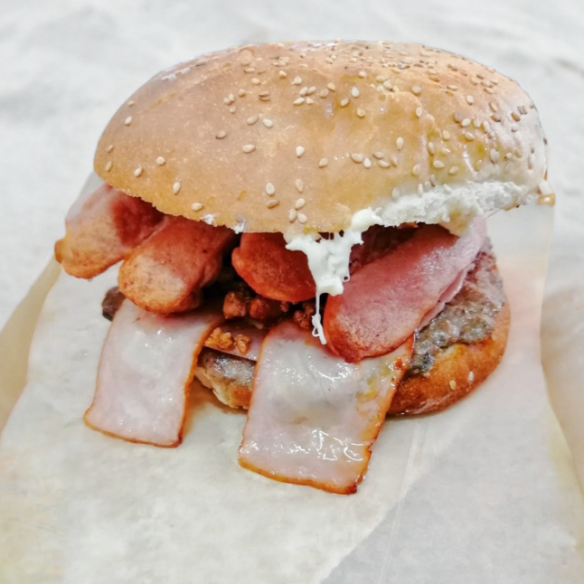 Telera doble con ajonjolí y una chuleta ahumada.